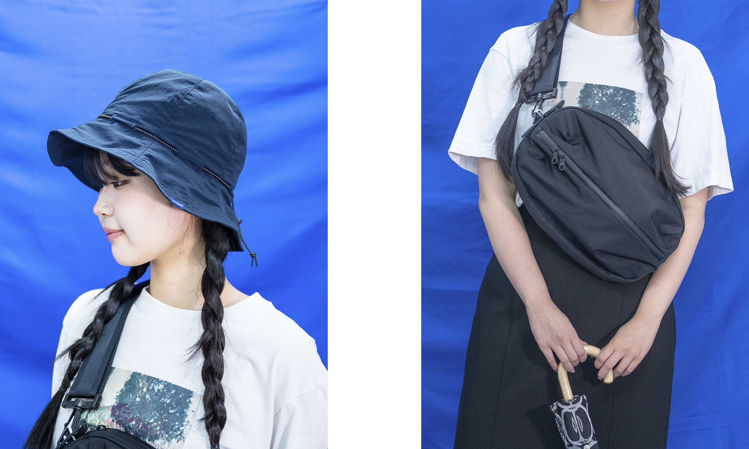 雨の日に守りたいのは頭と荷物。〈ATRENA〉の「コカゲル」ハットは、UVカットに撥水という贅沢機能付きで雨でも晴れでも活躍する万能アイテム。軽めの外出時の荷物ならスッポリ入る〈LIVERAL〉のバッグで、梅雨のお出かけに出発!