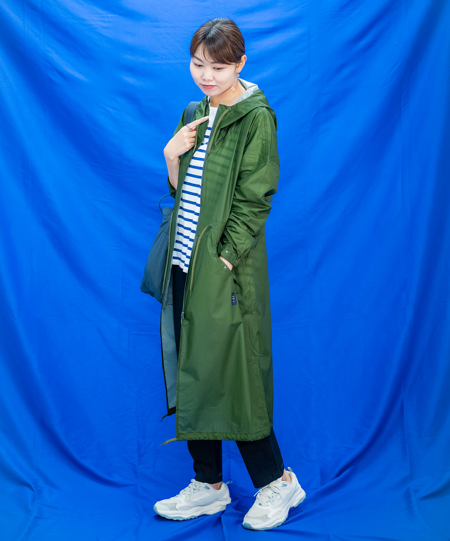 シンプルなデザインに防水・撥水・透湿という梅雨に嬉しい機能性付き、〈F/ACSION〉のレインコート。カジュアルにも通勤用にも取り入れやすいですね。