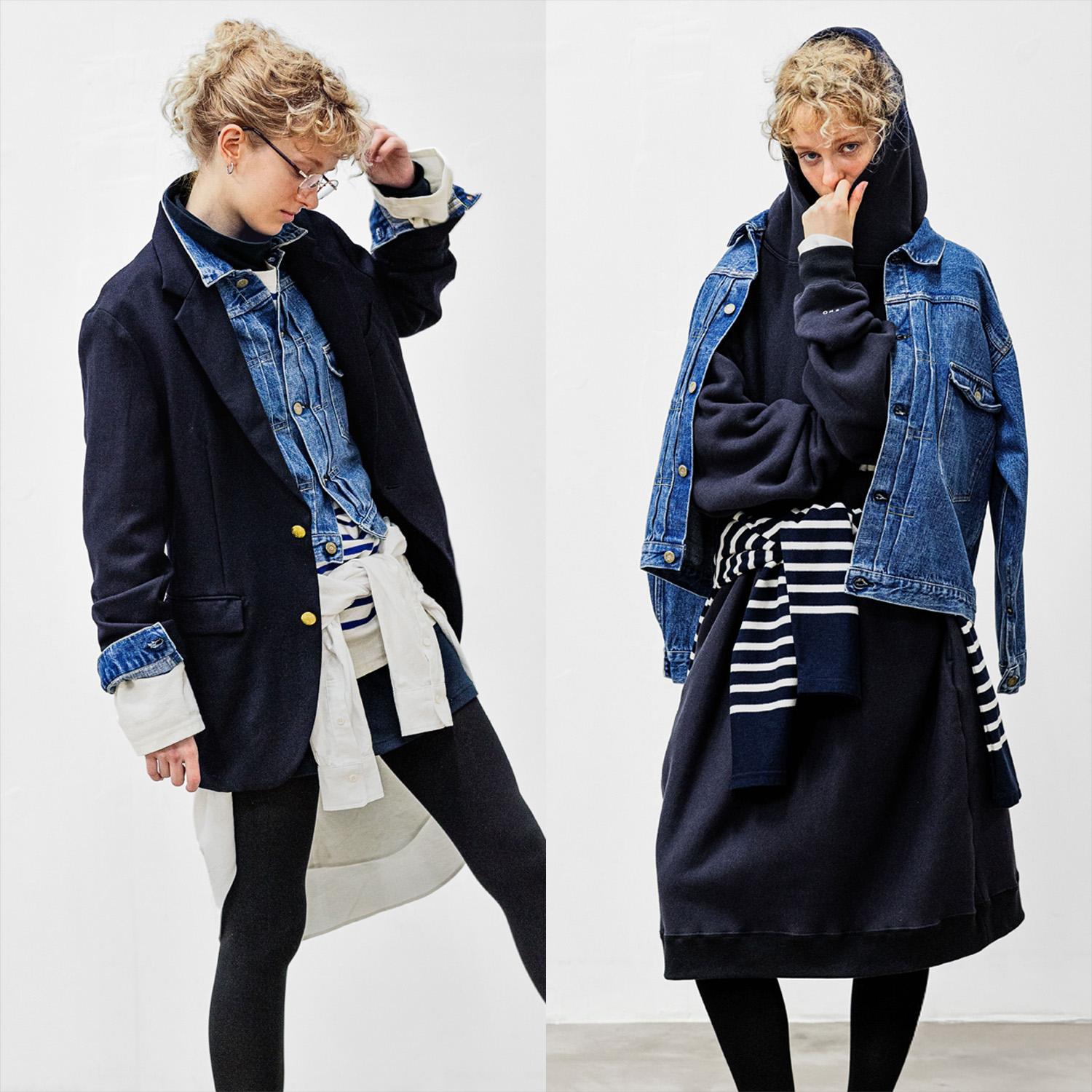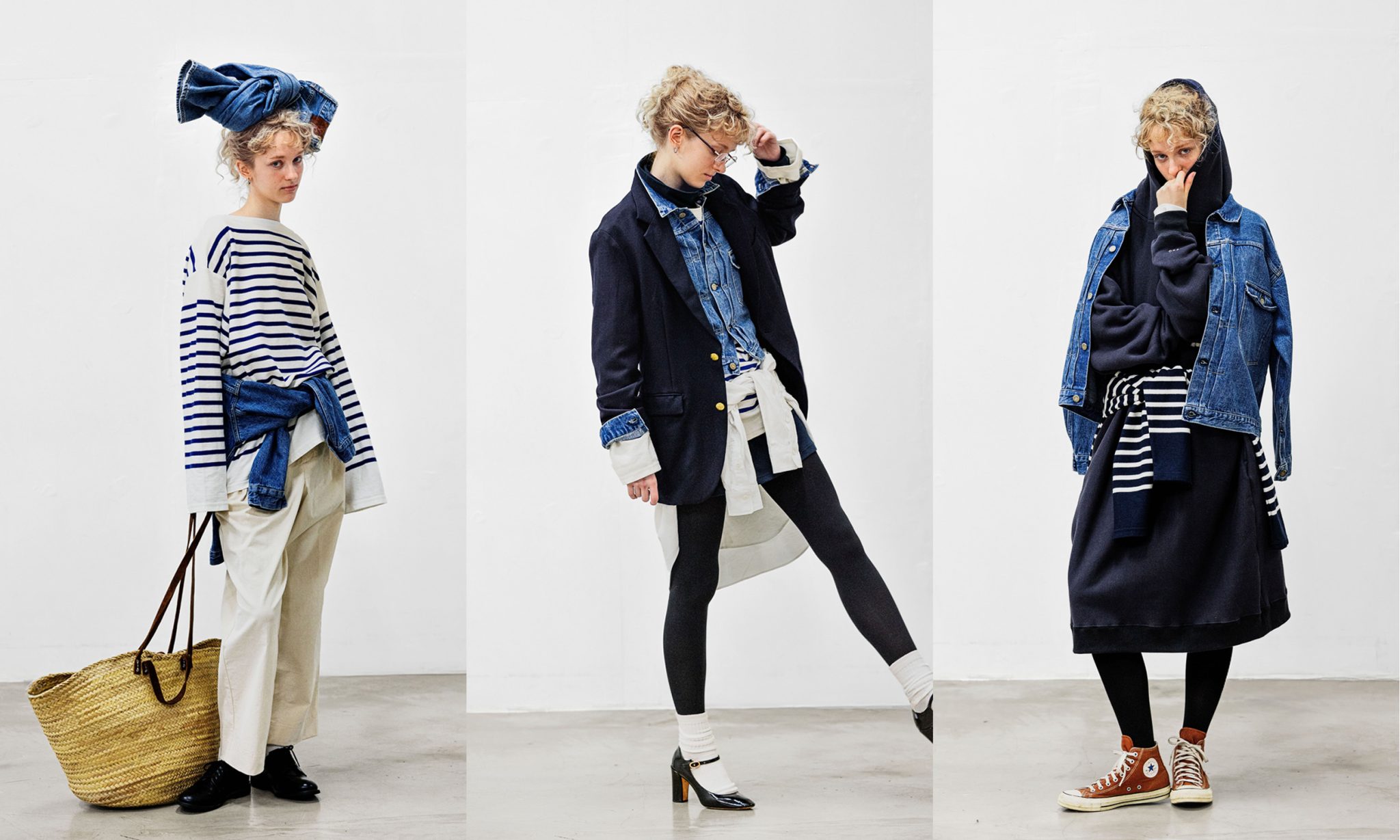 メンズウェアの定番を女性らしくリサイズしたデニムジャケットと、尾州産の紺ブレザーを重ねた、クラシックで洗練されたスタイリング。