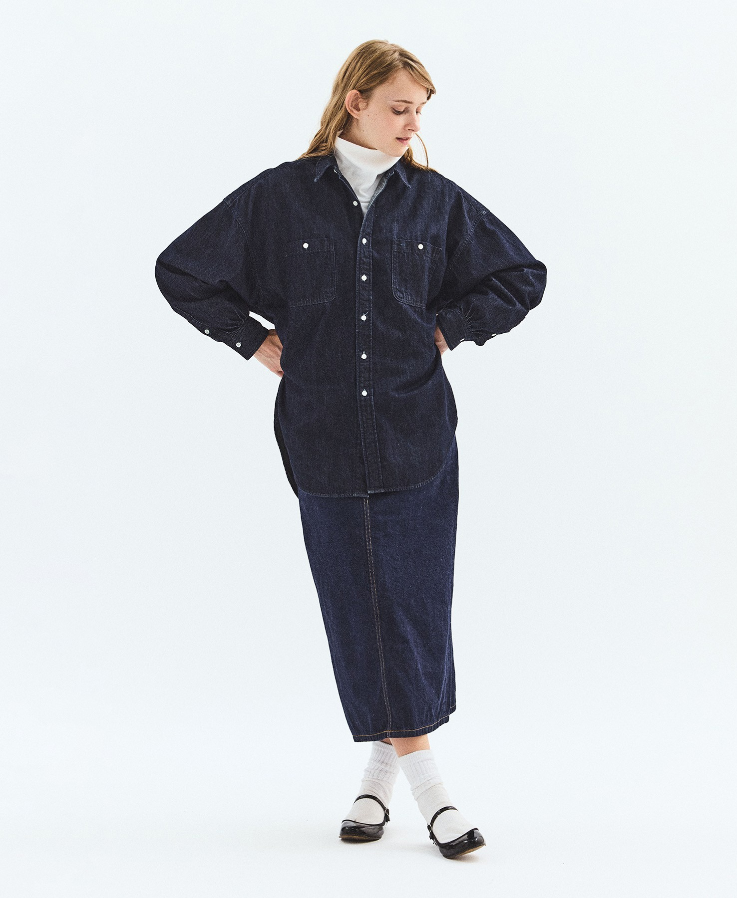 9オンスのデニムシャツと12オンスのマキシ丈スカートを合わせた、デニムオンデニムスタイル。 軽い羽織り感覚で着られるシャツに、ビンテージディテールが光るスカートを合わせることで、コーディネートに奥行きが生まれる。カジュアルながらも女性らしさを感じさせる、LENOらしいデイリーウェア。