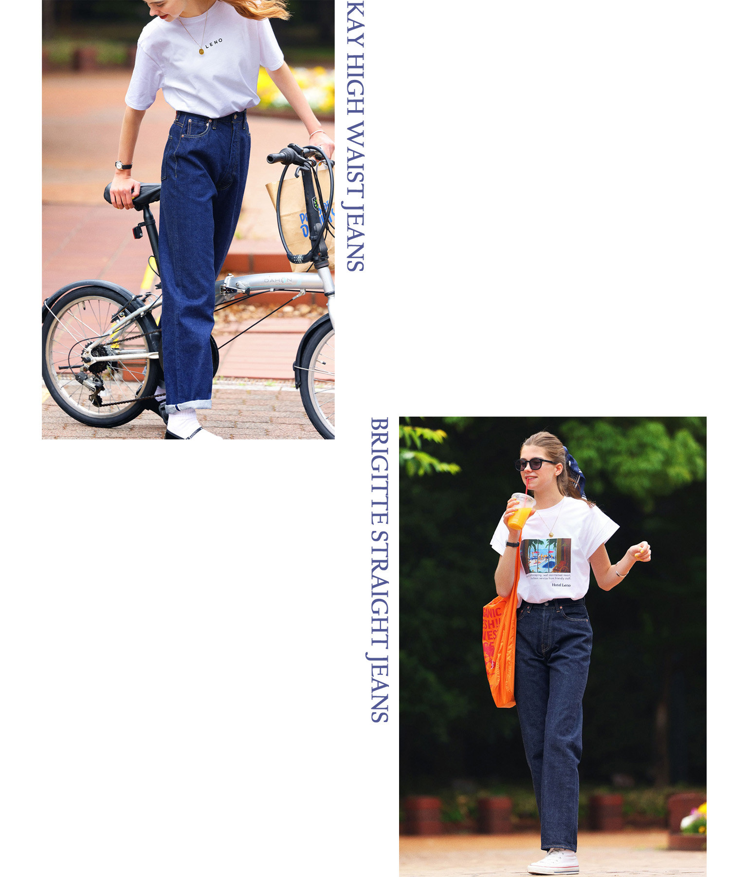 KAY HIGH WAIST JEANSは1940年代のヴィンテージデニムを再現したストレートジーンズ。 深めの股上とスッキリしたウエストに対し、ヒップから裾へストンと落ちるシルエットが女性らしさを引き立てる。 BRIGITTE STRAIGHT JEANSは女性向けに何度もパターンを見直して作り上げたスリムなストレートジーンズ。ハイウエストと美しいヒップラインで脚をすっきり見せ、穿き込むほどに奥行きある色落ちと風合いを楽しめる一本。