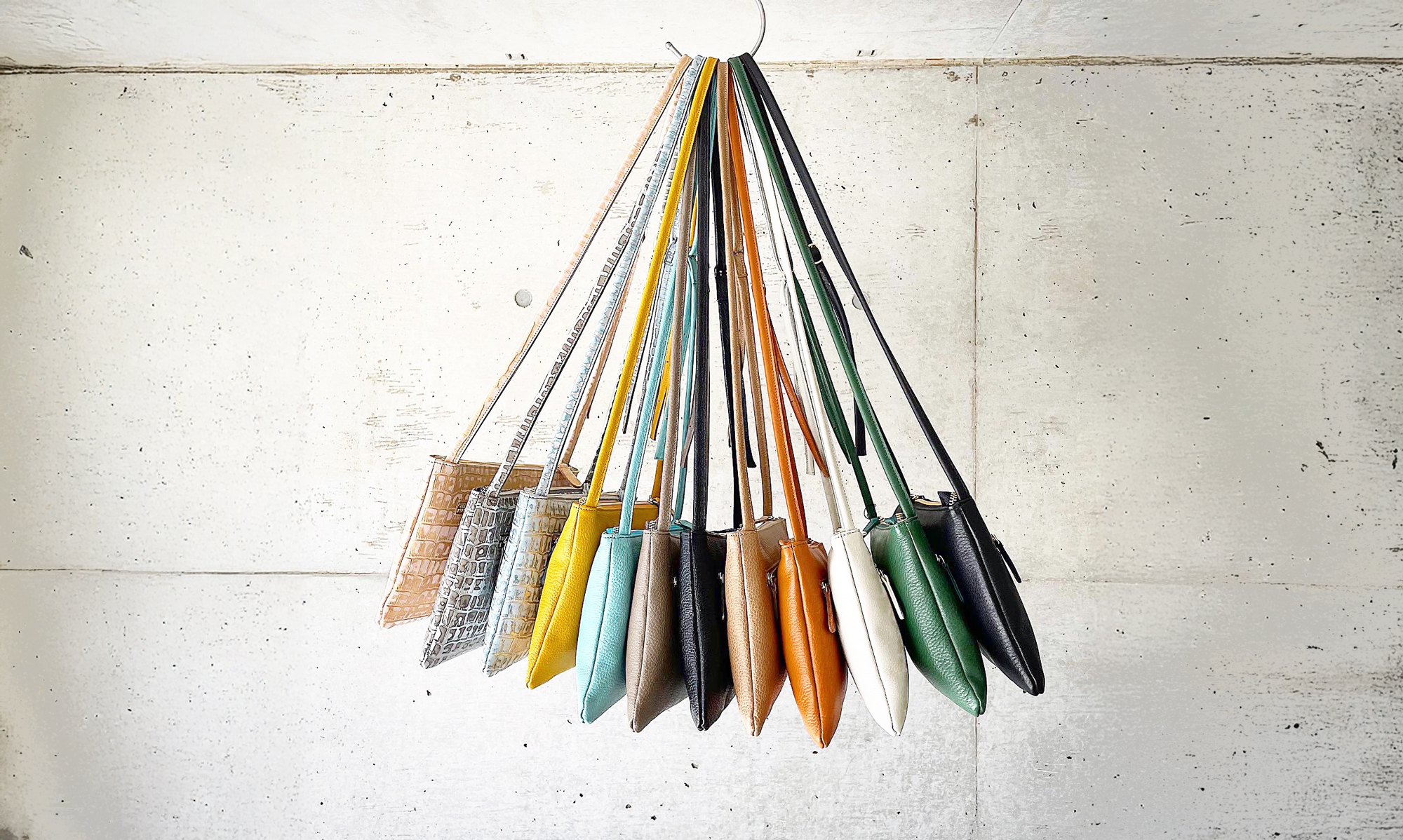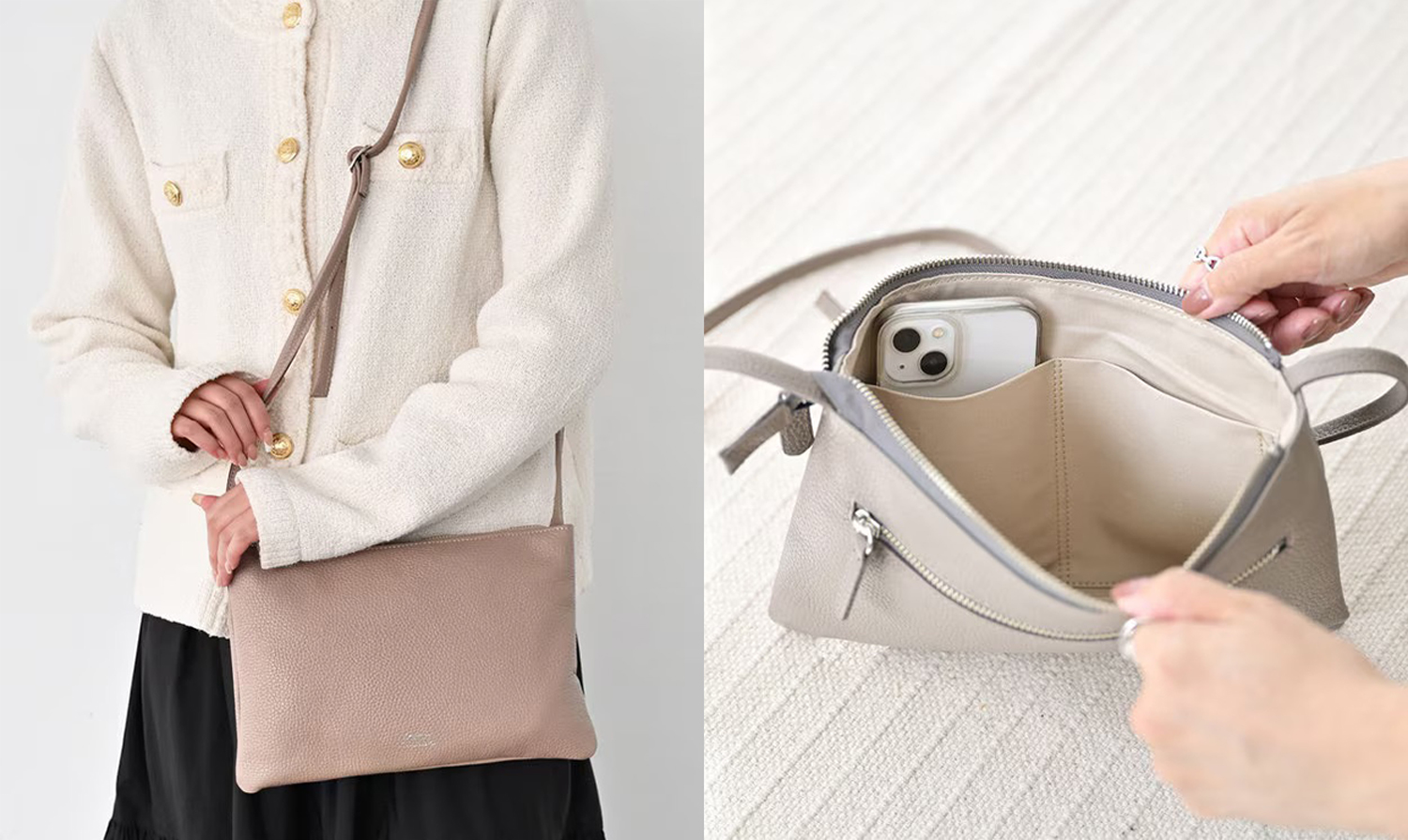 磯部さん: CRAHUGでも売れている1024番の横型のショルダーバッグのデザインは、実は妻が子育て中に使っていたバッグの経験が元になっています。子育てをしている時は子供と手を繋ぐことが多く、外出先でもお財布やハンカチなどを簡単に出しやすいような、コンパクトでもしっかり入るものが欲しいという妻のアイデアをもらって、バッグに落とし込みました。お客様の声も、非常にコンパクトだけど、十分に物が入り使いやすく軽いとおっしゃっていただけます。