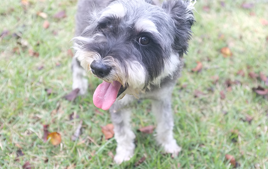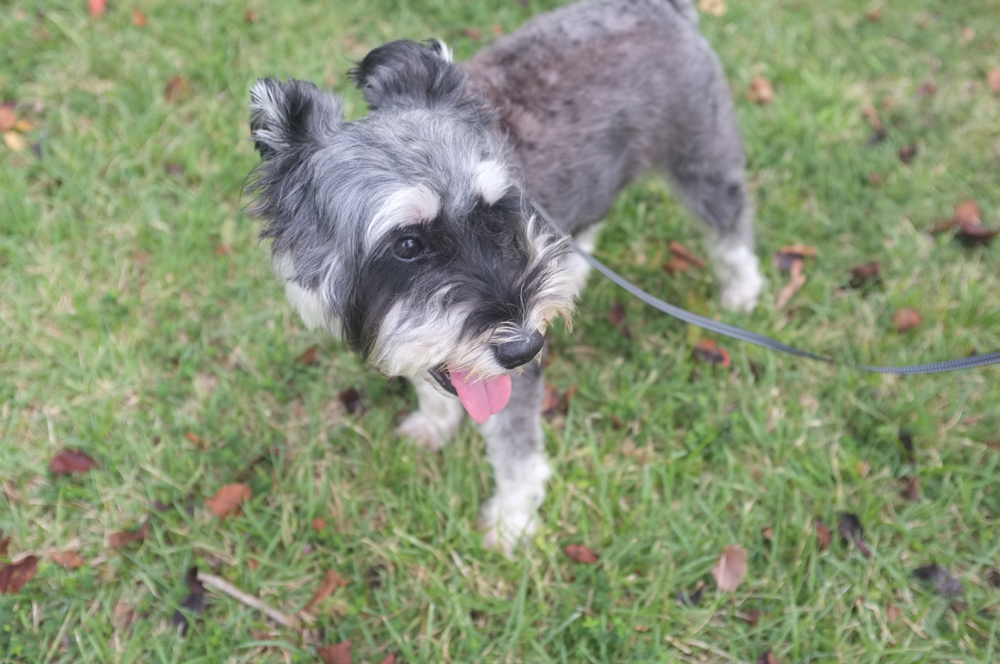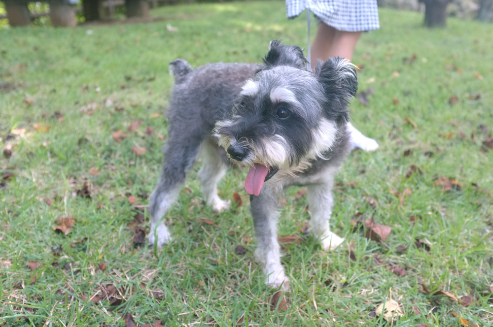 まゆ毛と短いしっぽがチャームポイント♪ミニチュアシュナウザーの「むぎ」だよ。