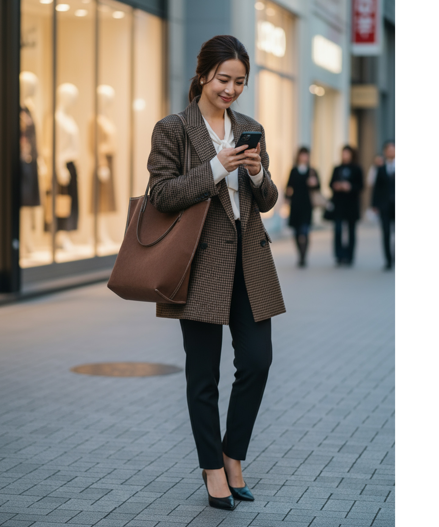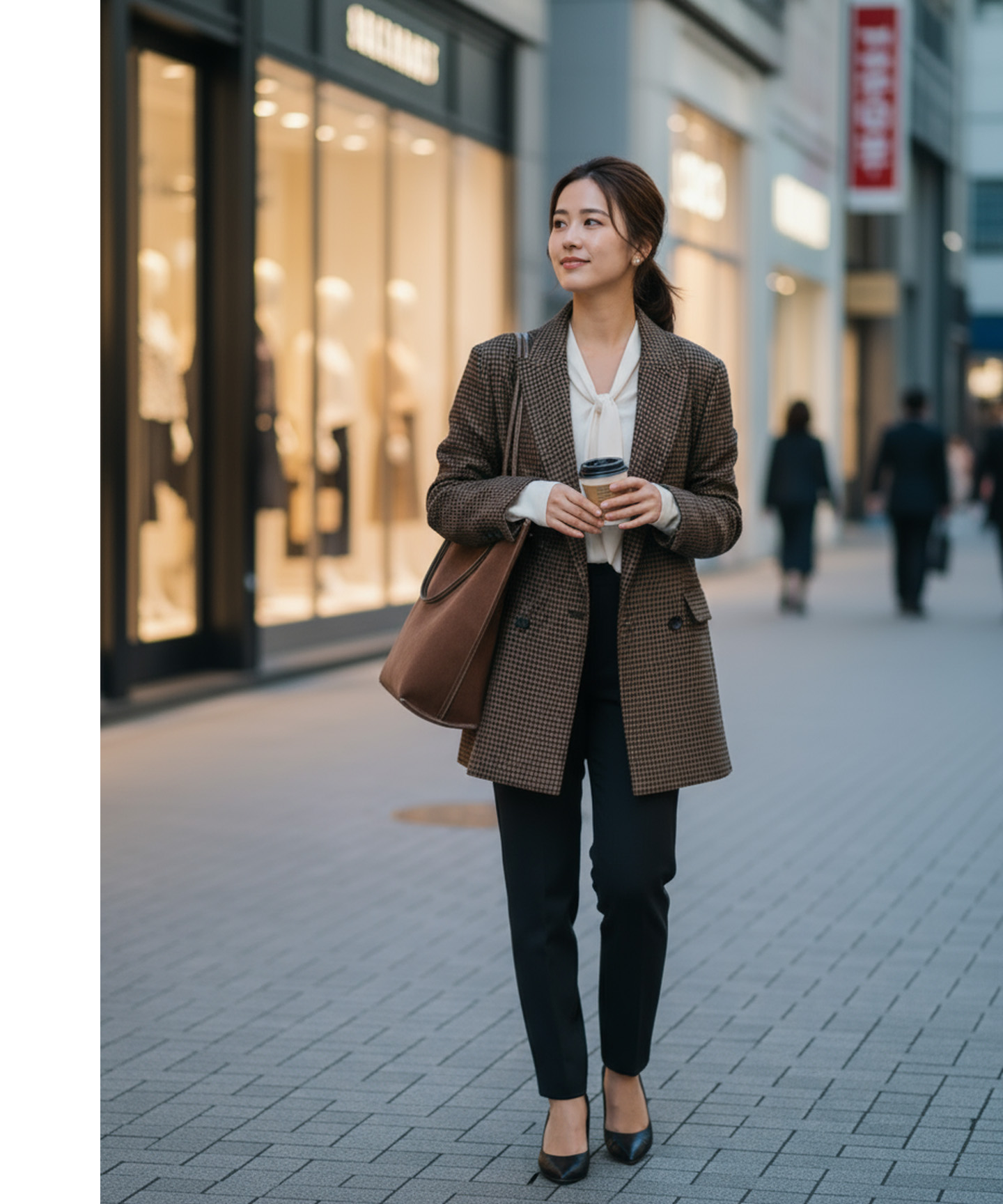 トレンドの格子柄のジャケットは、秋口には重宝するちょうど良いキレイめアウターとしてお仕事用にも普段着用にも使いやすい。仕事用のPCなどもしっかり入るバッグには、週末だからこそ一週間頑張った自分へのご褒美も詰め込んで帰宅してほしいです。