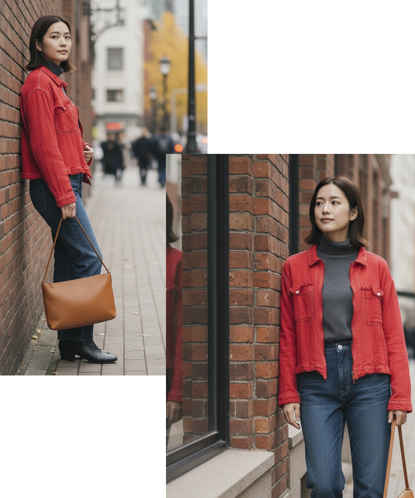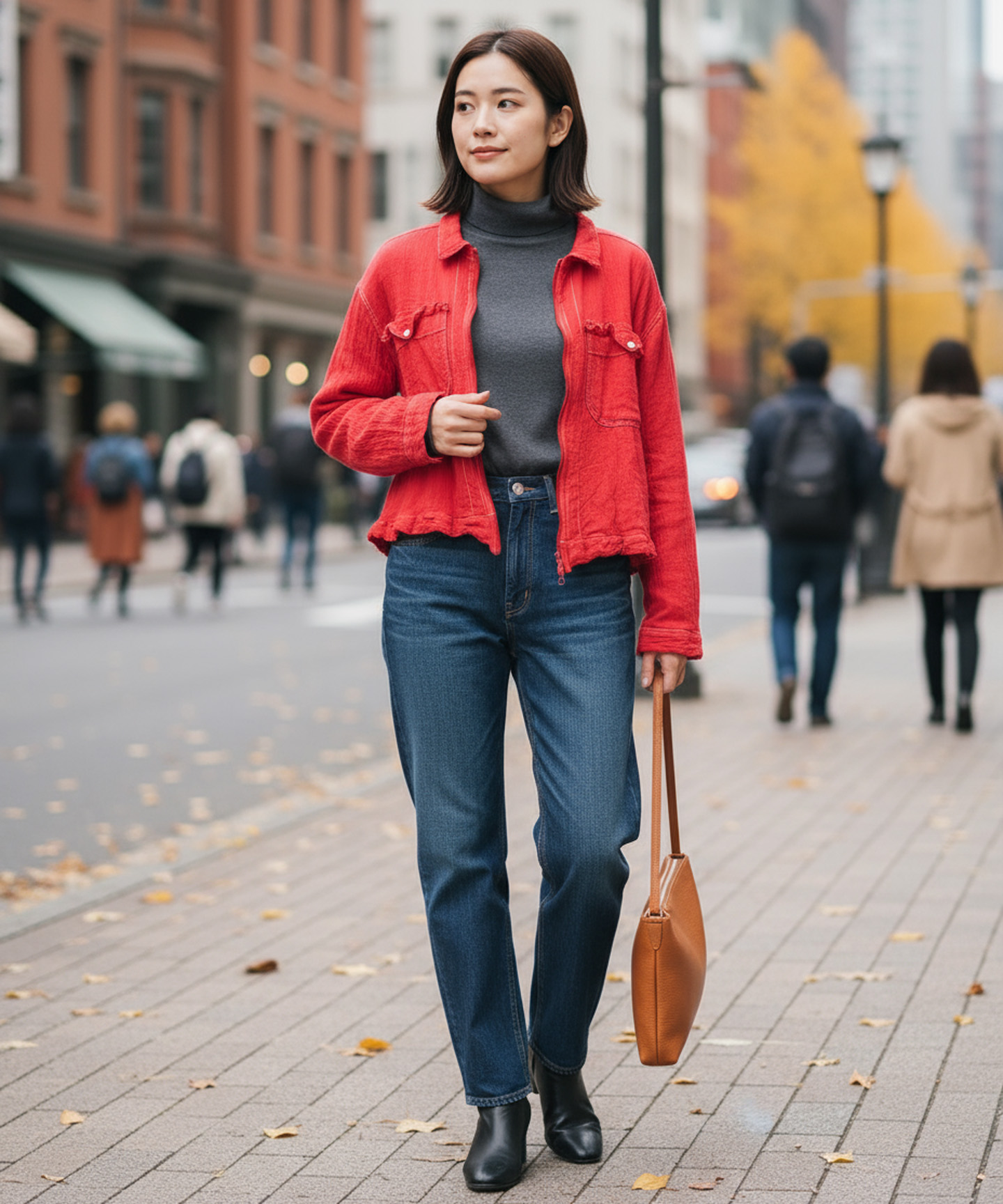 気分が落ちたときこそ着るものは明るくしてみましょう。気分を上げてくれるビビットな赤のジャケットは肌寒い時期にちょうど良い羽織ものとして、デニムと合わせてマニッシュな感じに。