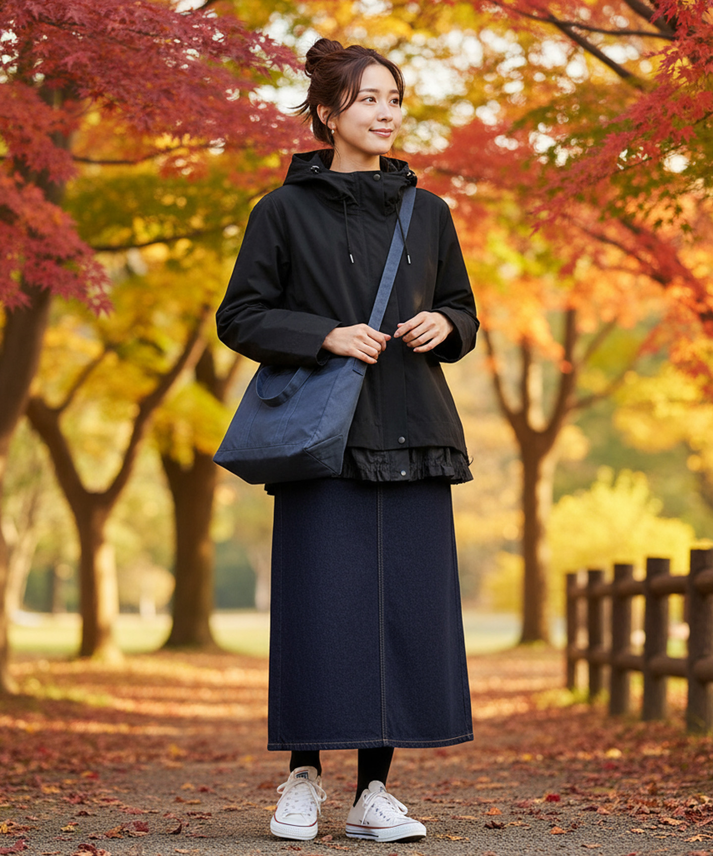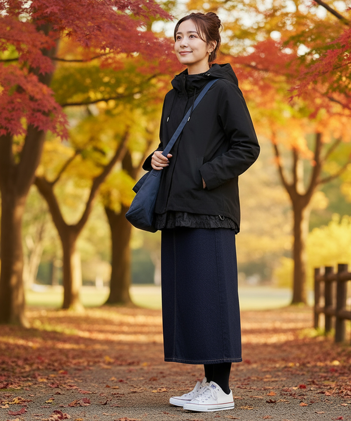 長くしつこい暑さから解放された秋には、紅葉など自然を見に行くことも多いのでは?街中よりも少し気温が低い自然の中では体温調節のできるアウターをしっかり着用しましょう。