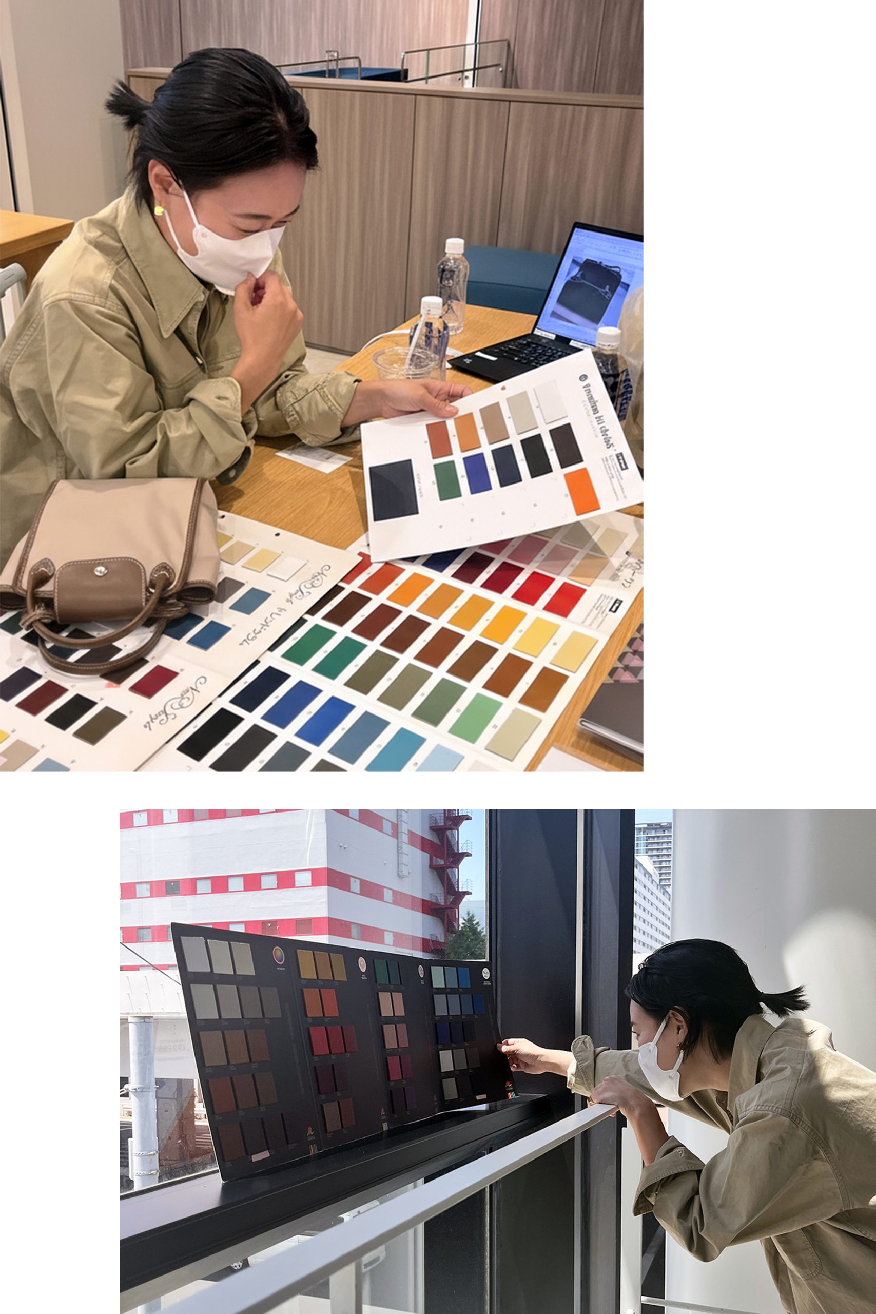 既存のバッグを参考に、カラーや質感を一つひとつ丁寧に検討していきます。