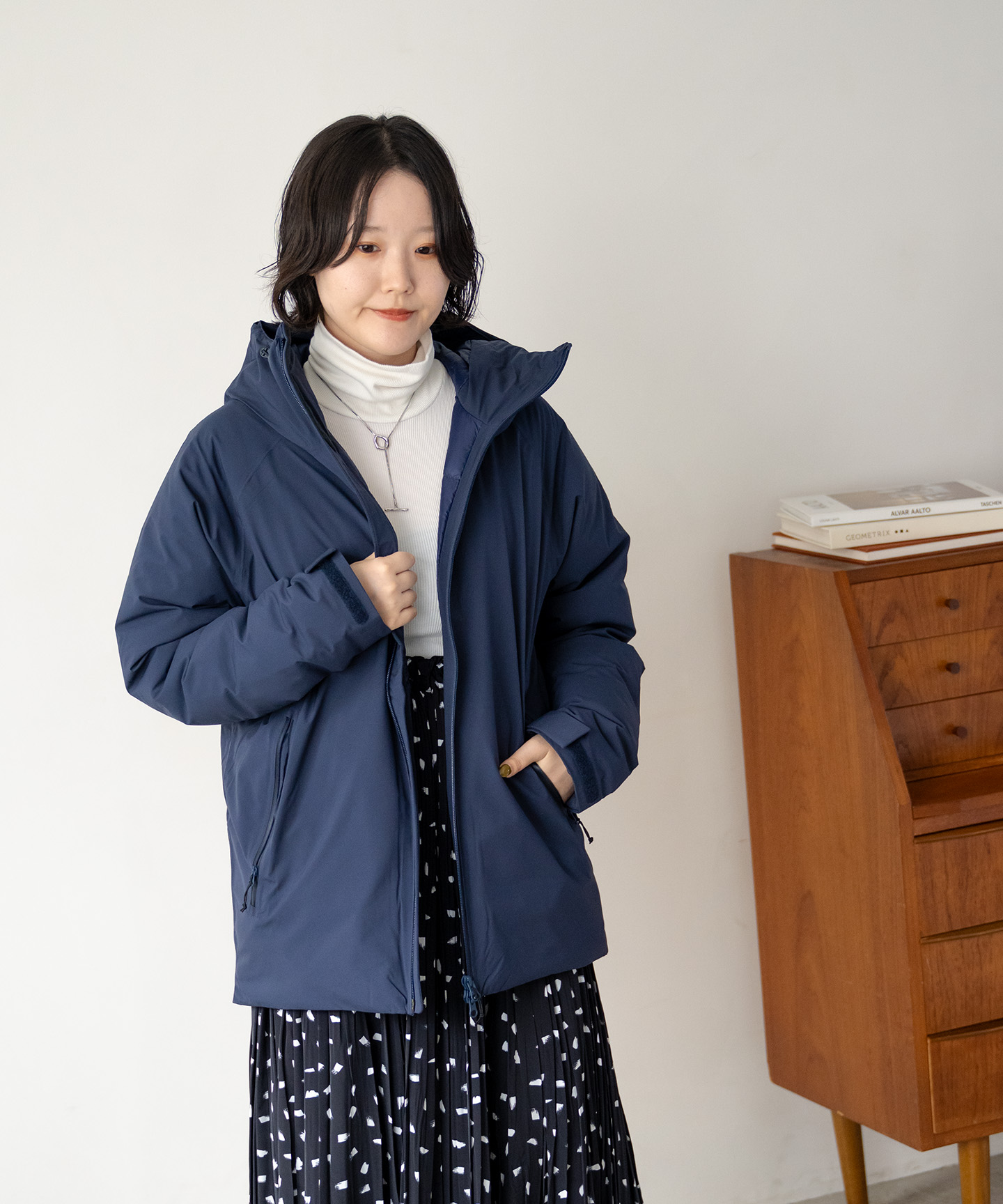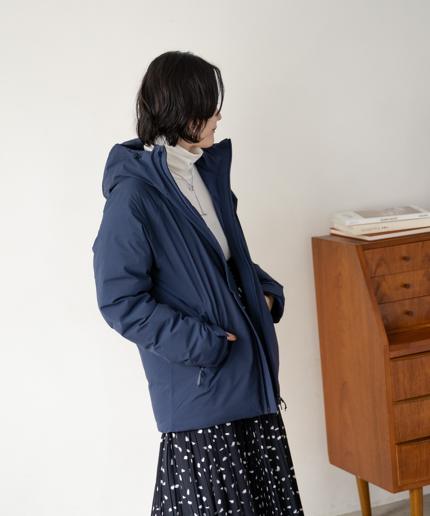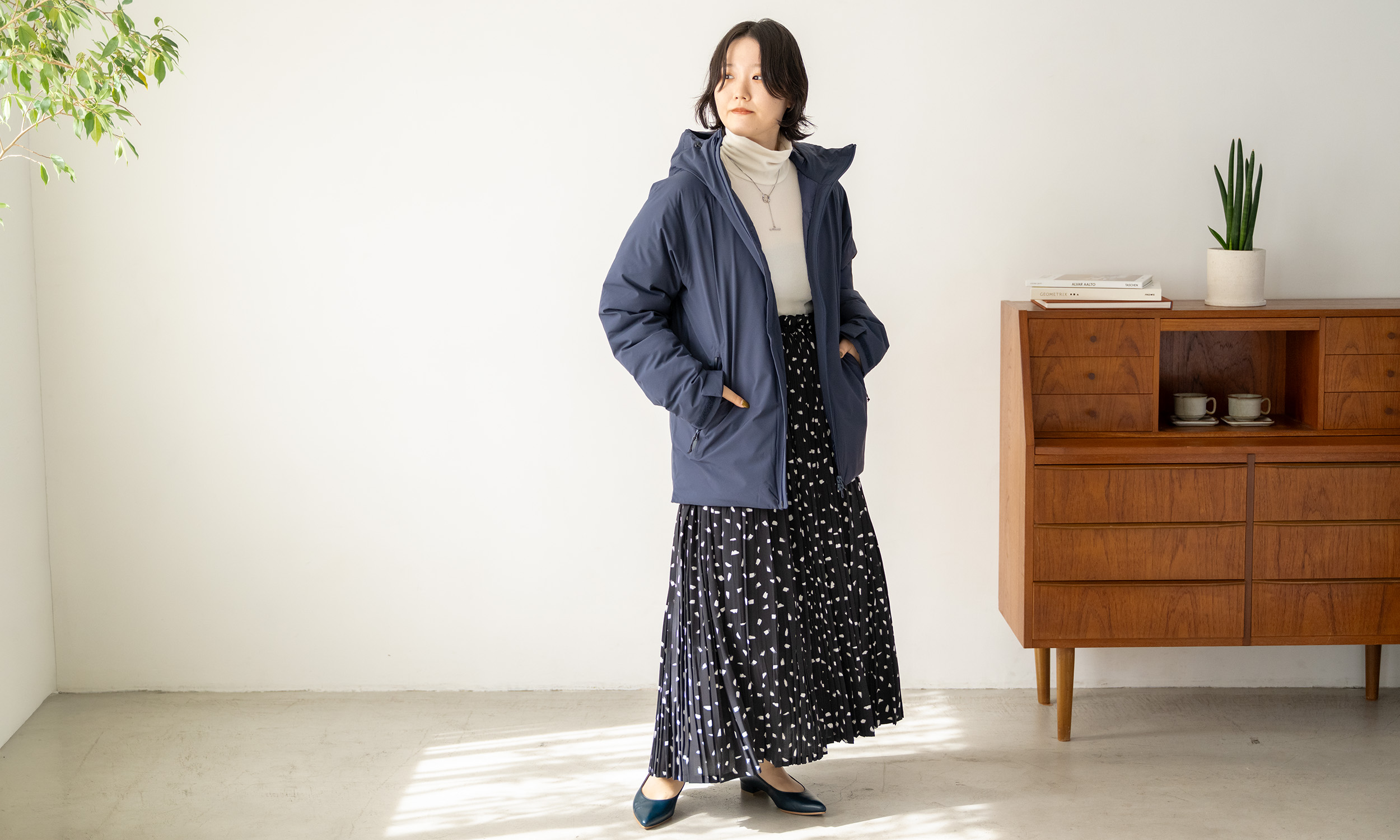 デイリーで使いやすい防水仕様のダウンジャケット。定番の黒や白のアイテムとも相性が良いネイビーカラーは明るすぎず、意外に秋冬の色に合わせやすい。女性らしいニットやスカート、パンプスと少しカジュアルなデザインのダウンをMixすることで、全体的に大人らしい落ち着いた雰囲気に。