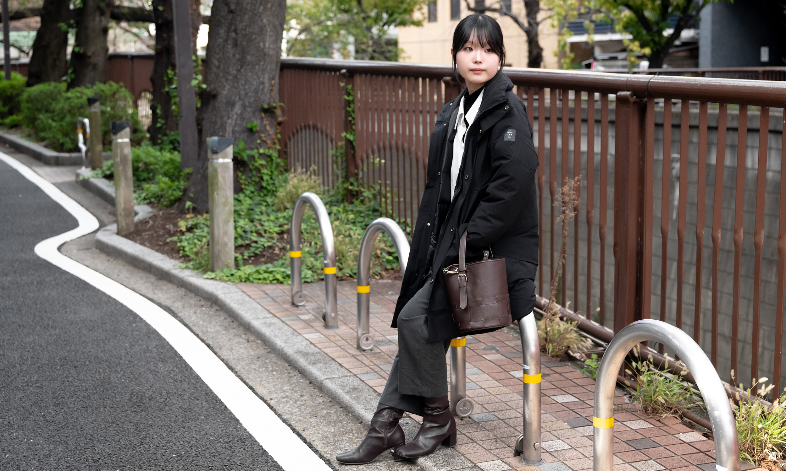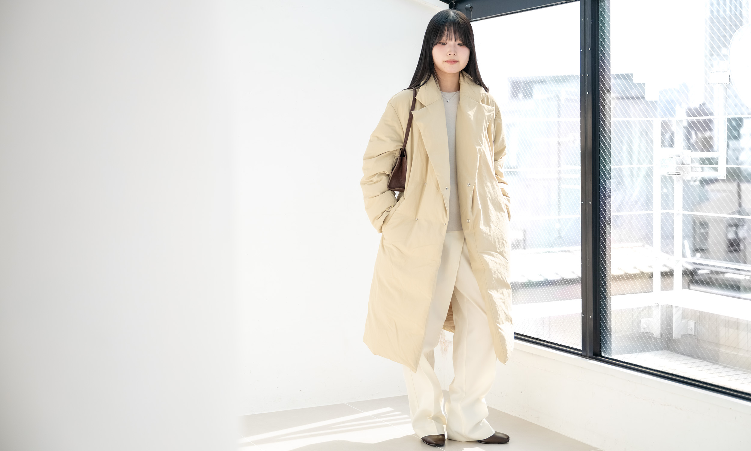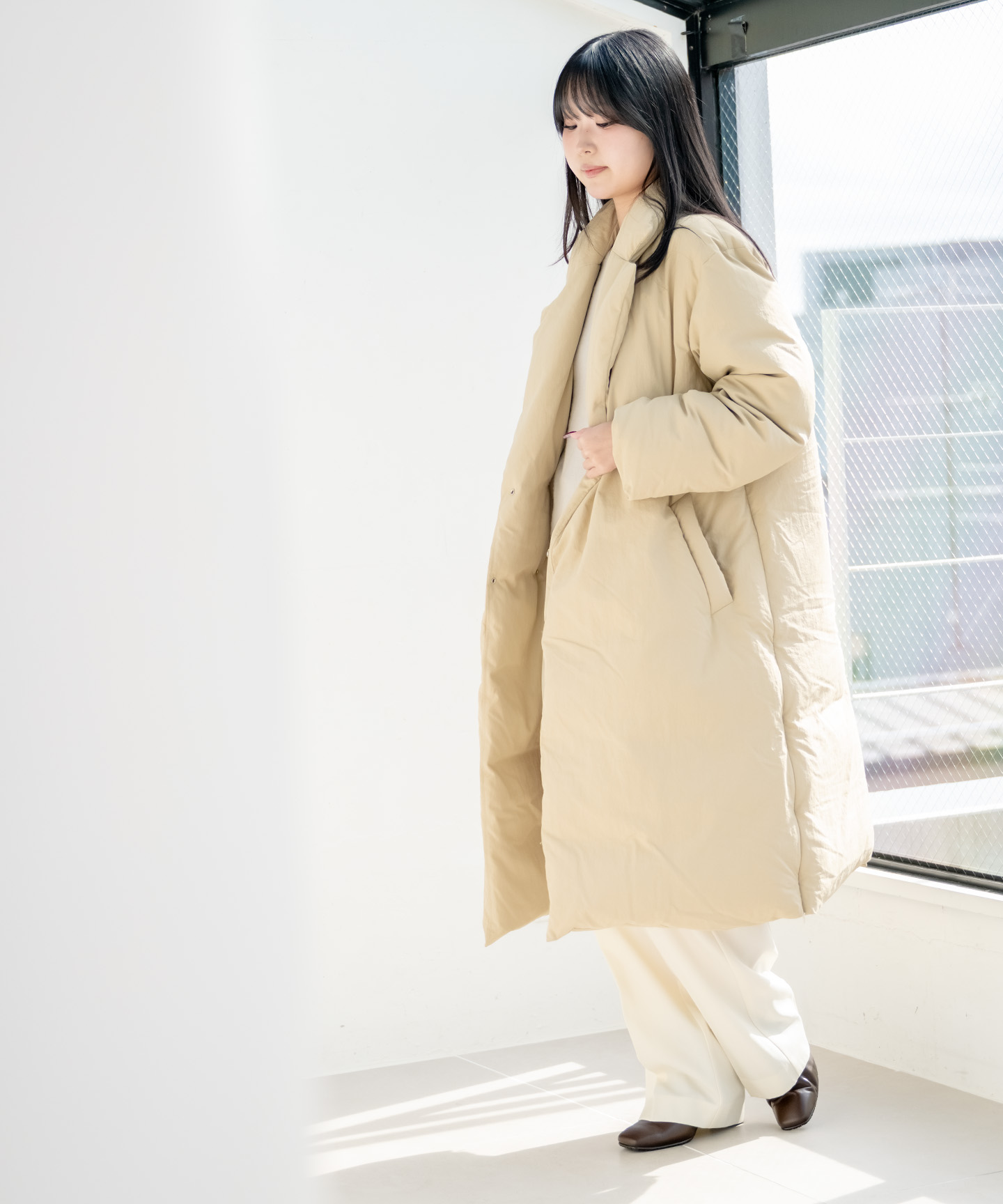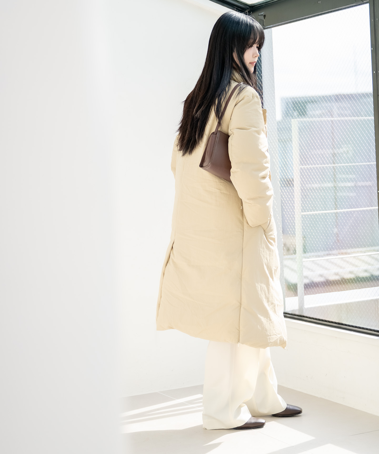 チェスターコートシルエットのクラシックな一枚。エレガンスさを感じられるような薄めの色を基調として、バッグとシューズの濃いブラウンがアクセントになるスタイリングに仕上げました。上品ながらに優しい印象のベージュカラーのダウンがクローゼットに一枚あると、コーデの幅も広がります。非常に保温性の高いジャパンダックを羽毛として使用しているので、随一の防寒性を備えた逸品です。