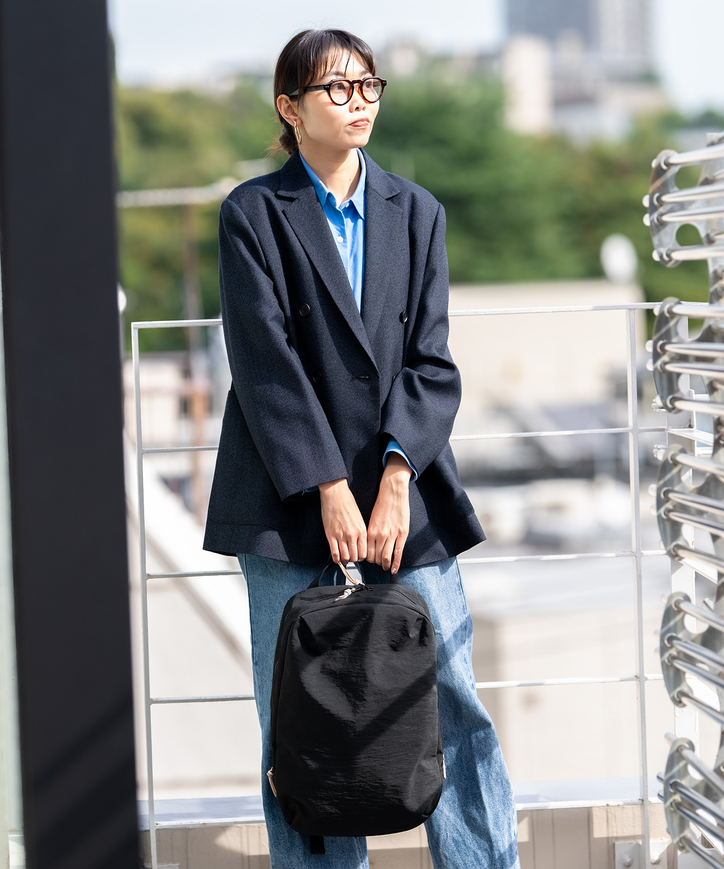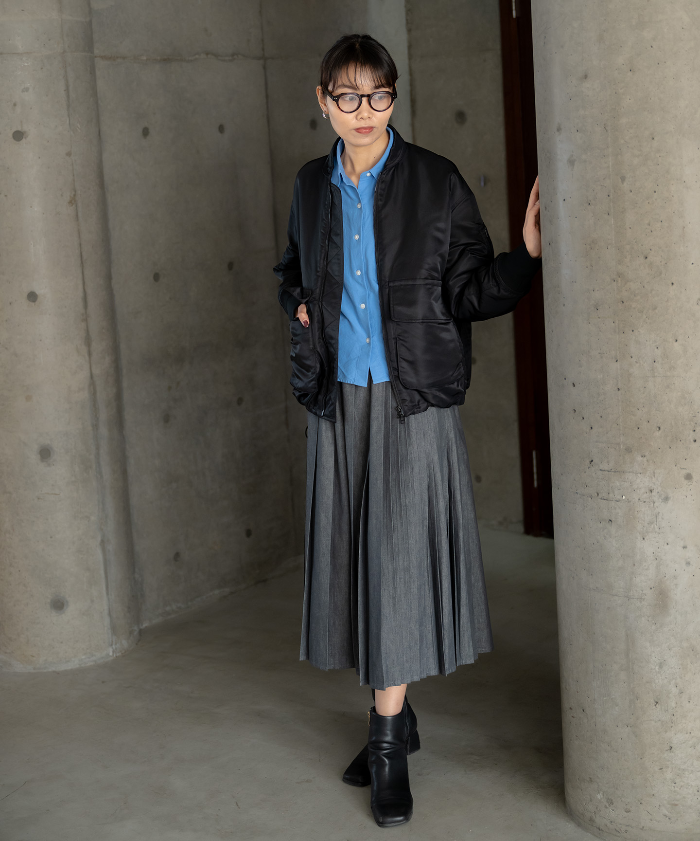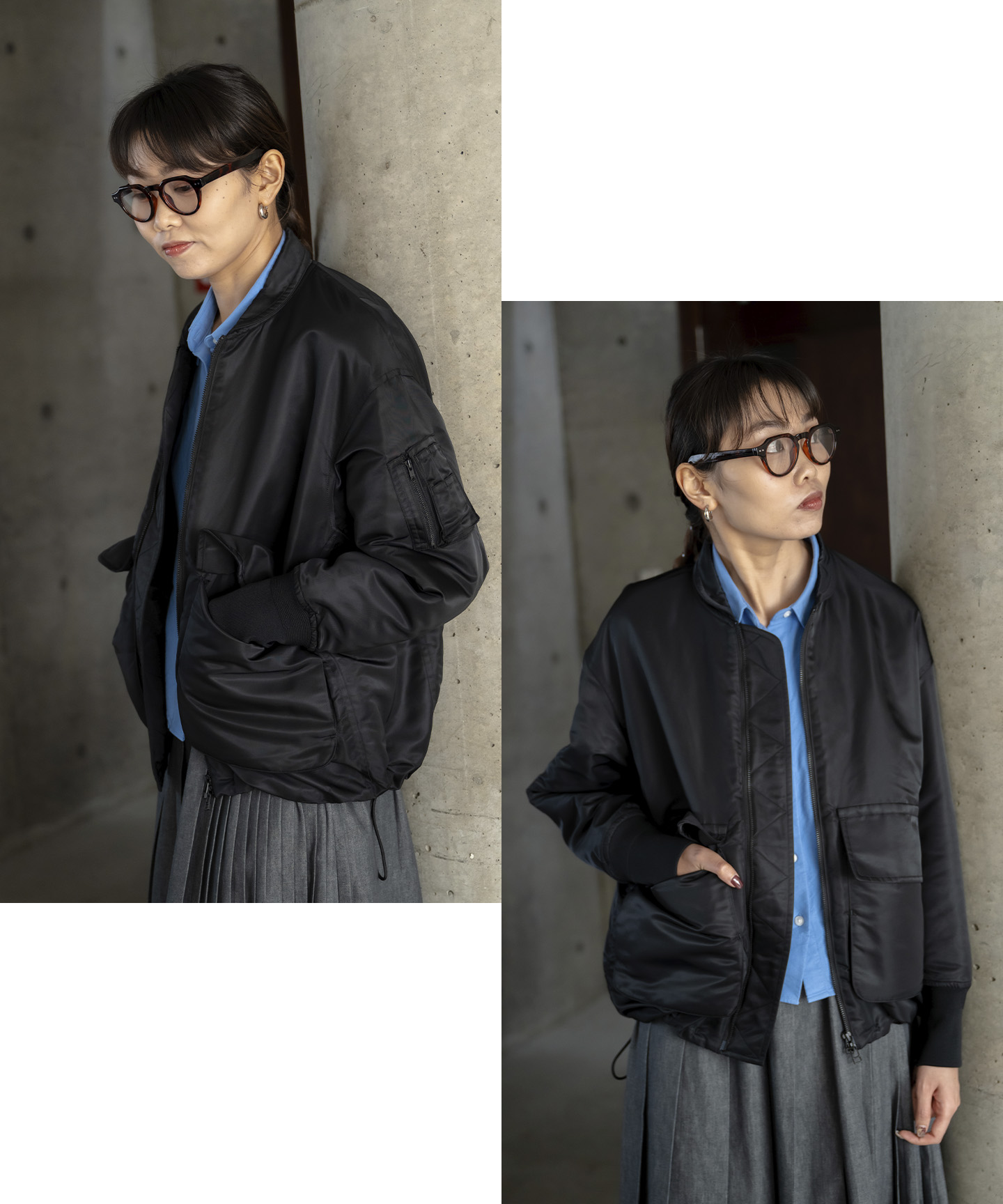 光沢感のある美しいナイロンブルゾン。マニッシュな雰囲気のブルゾンには、モノクロトーンにブルーのシャツを入れることで女性らしさを演出。従来のブルゾンとひと味違う印象を与えてくれる一枚です。