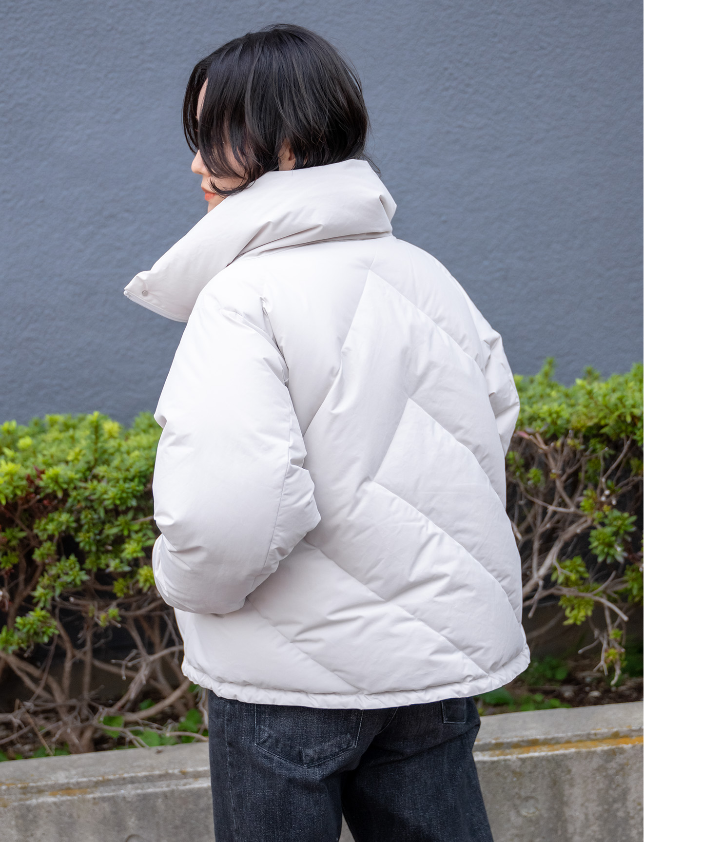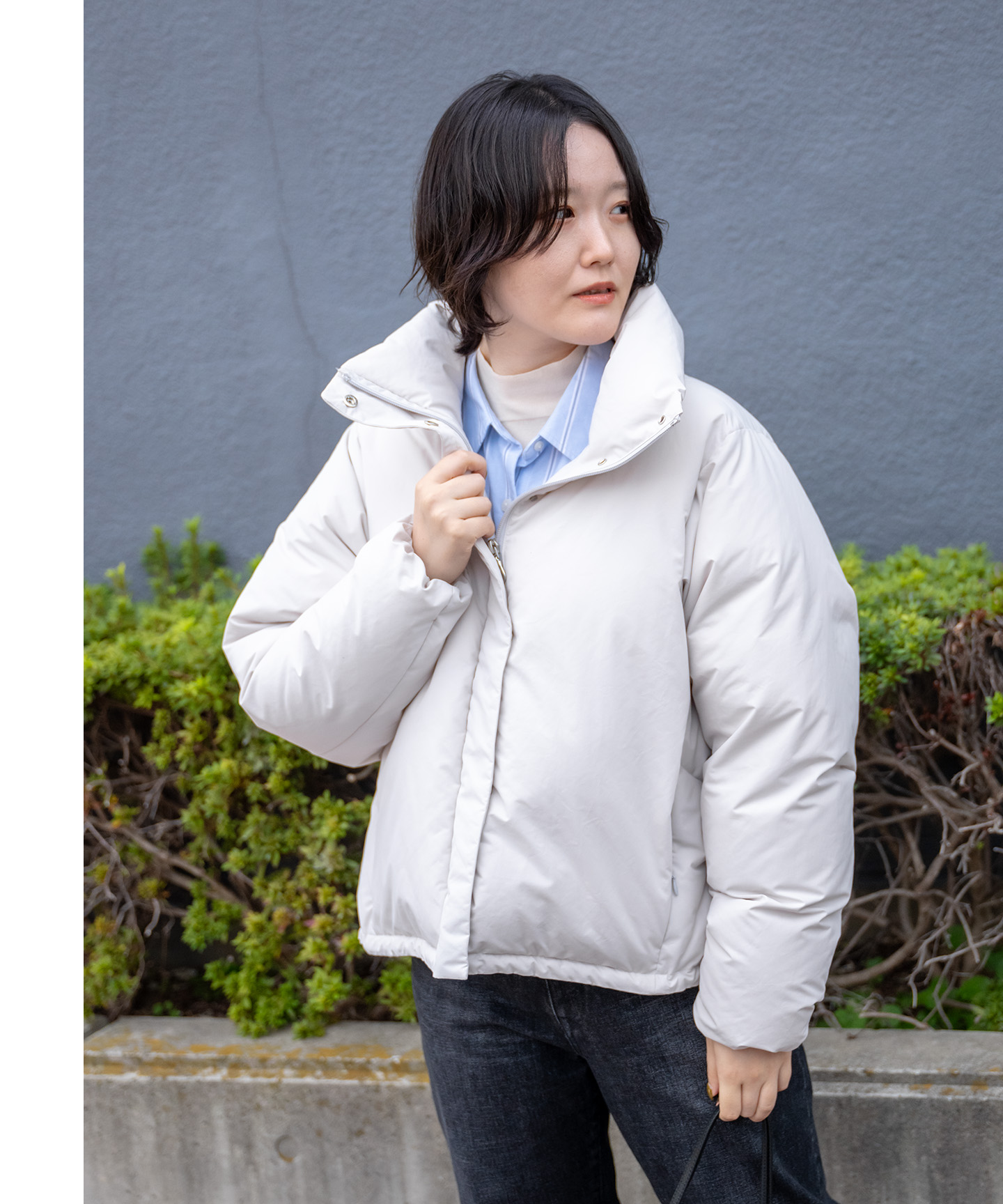透き通ったアイボリーのスタンドカラーダウン。上下白黒でメリハリのあるコントラストにこちらもブルーをワンポイントで合わせてみました。デニムでカジュアルダウンしても、スカートやトラウザーでキレイめに仕上げても様になります。少し短めの丈に大胆なAラインのシルエットが美しく、そして日本の羽毛の温もりを感じられる冬の主役ダウンです。