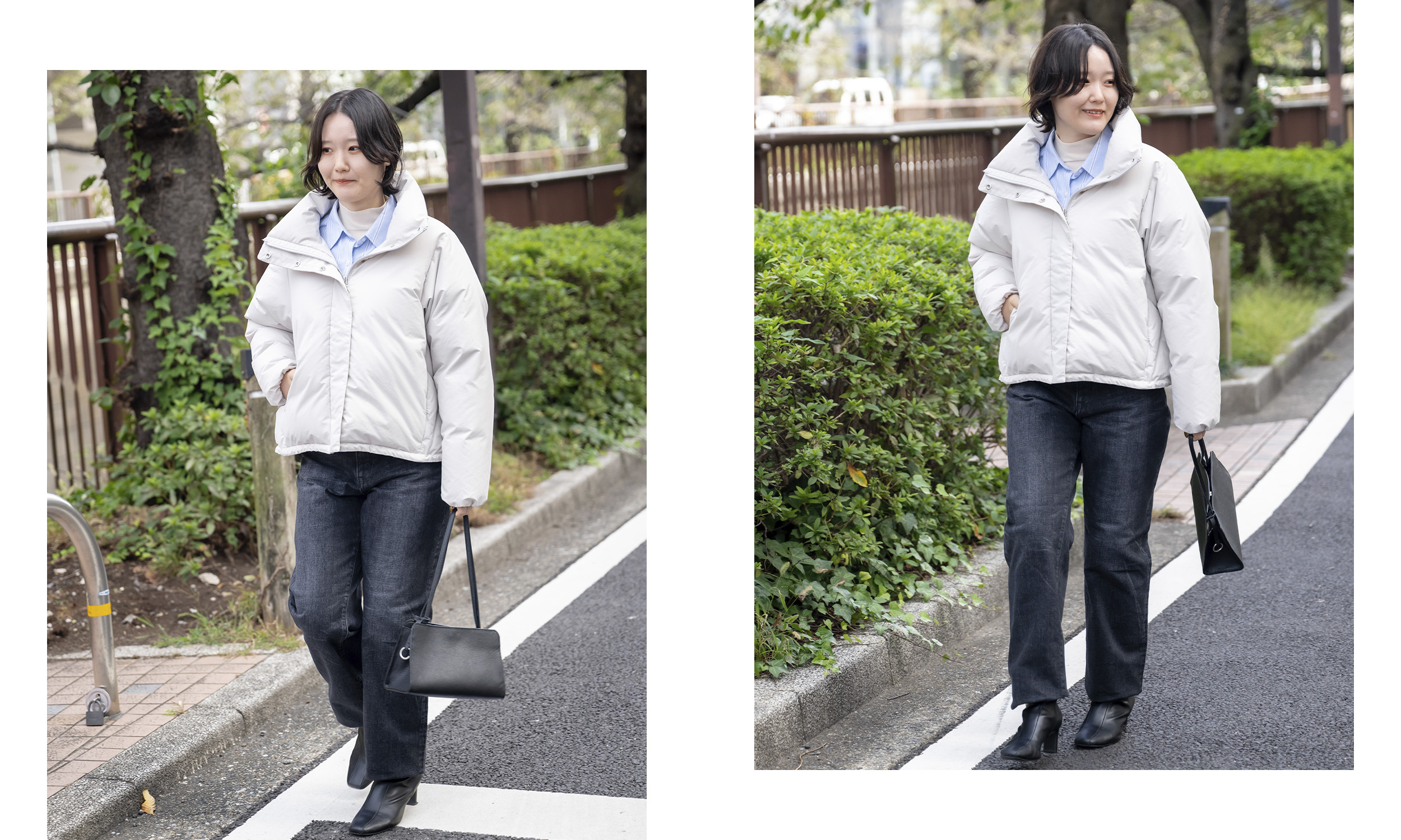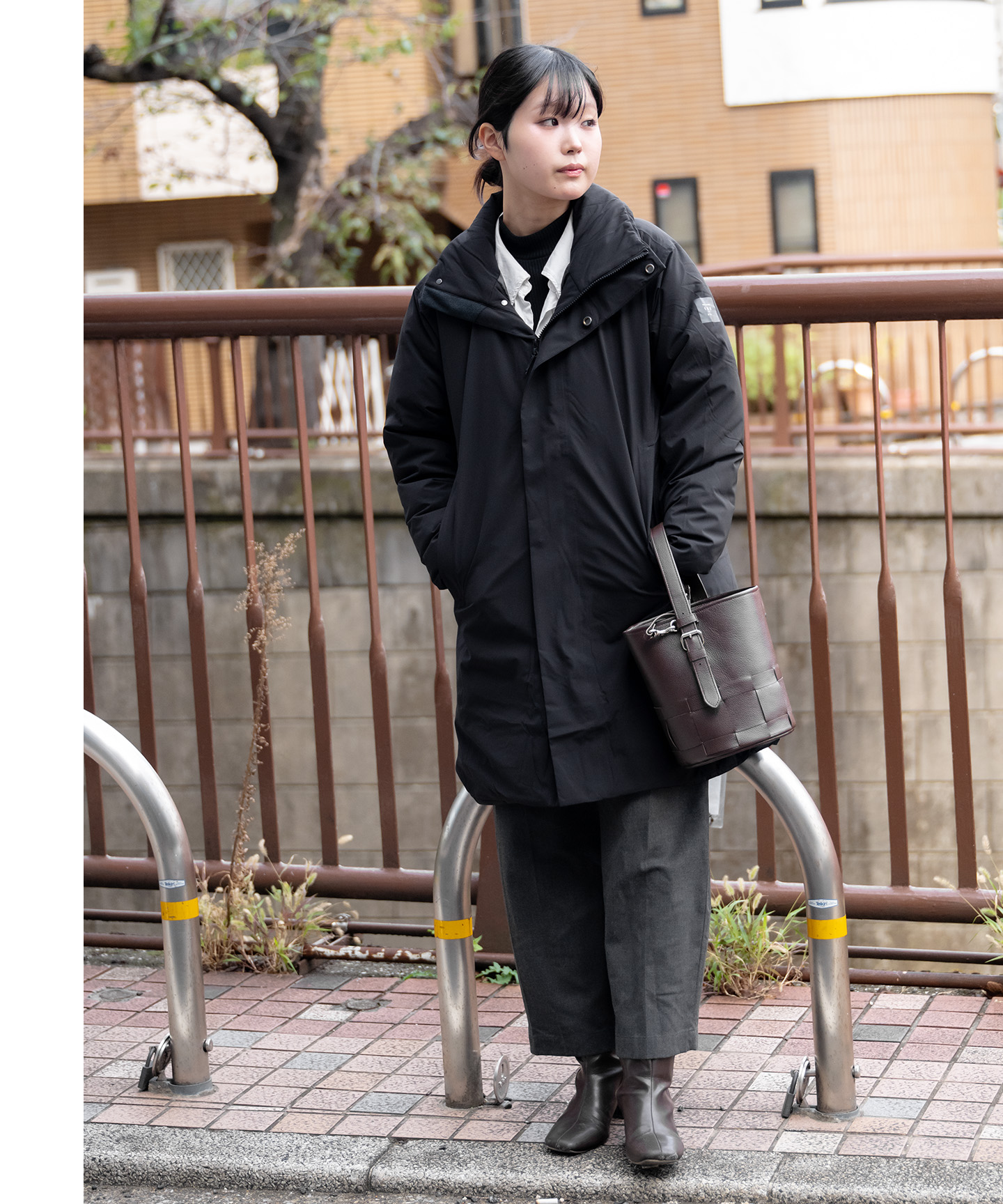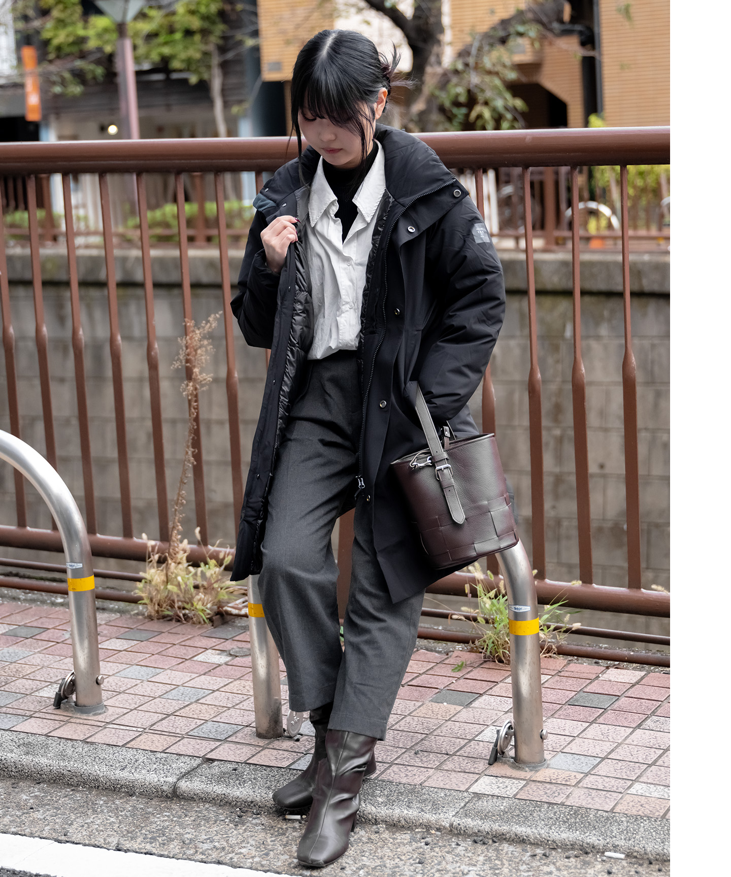 ステッチが見えないシンプルなデザインのダウンコート。グレーのワイドパンツと白シャツに合わせてキレイめな印象に。防水・撥水機能が備わっているので雨の日でも気にせず着れるのも嬉しいポイント。お仕事の際のジャケットコーデに合わせるも良し、デニムやニットと合わせてカジュアルな装いをするも良し。色々なシーンで使い勝手の良いダウンです。