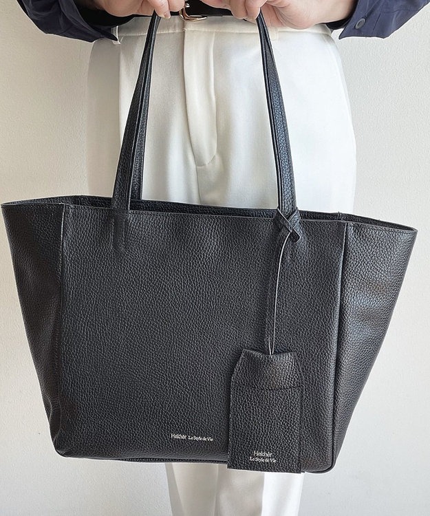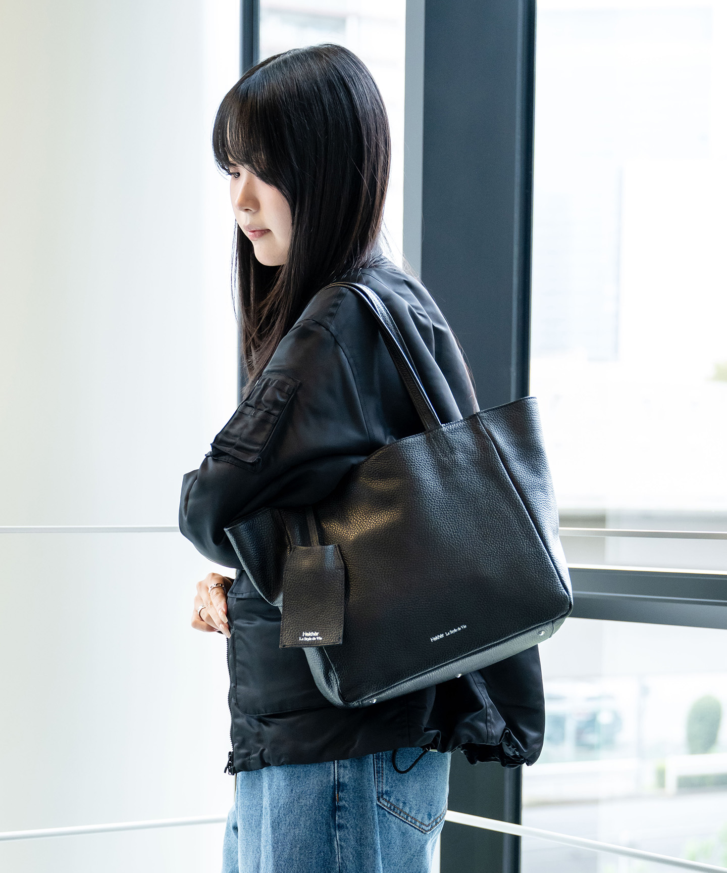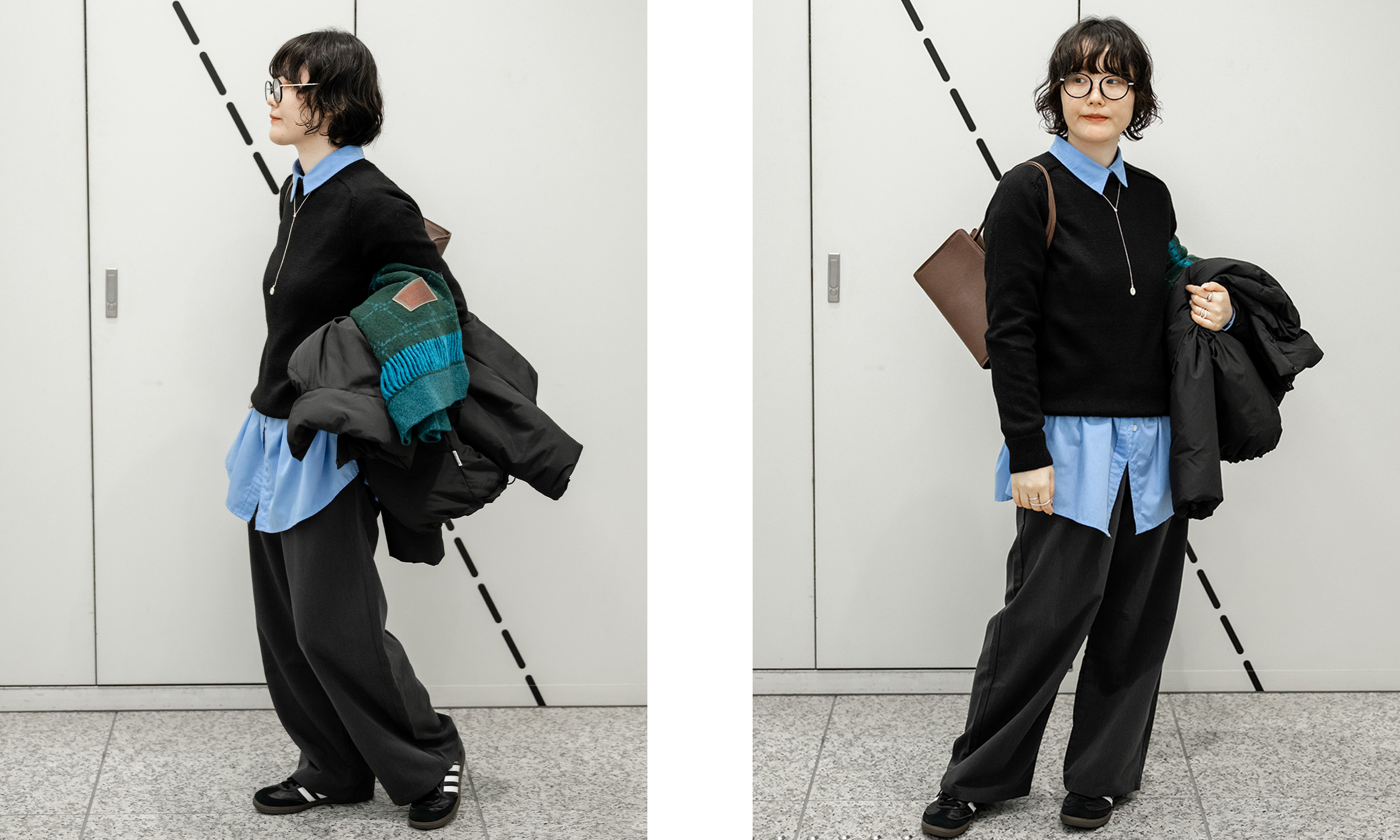 黒をベースに、シャツのブルーと小物のブラウンで抜け感を添えたミニマルスタイル。 レイヤードのバランスで、きちんと感と軽やかさを両立した出勤コーデです。