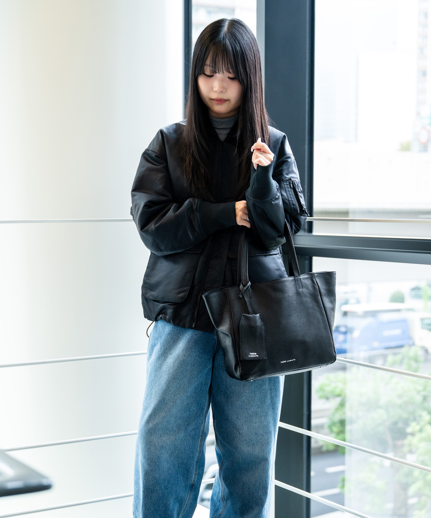黒のブルゾンにデニムを合わせた、都会的で抜け感のある出勤コーデ。動きやすさときちんと感を両立した、毎日に頼れるスタイルです。