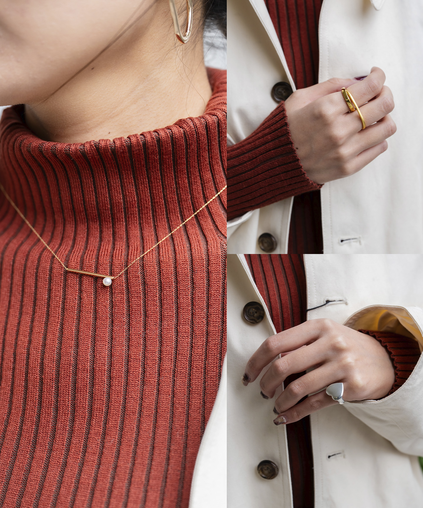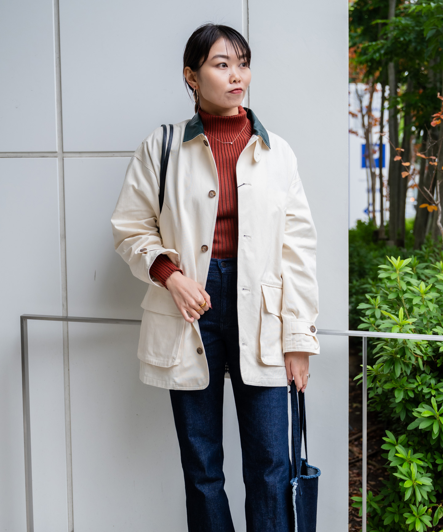 クリーム×ゴールドアクセサリー×インディゴの配色が、冬の空気に映える一着。 きちんと感と抜け感をバランスよく取り入れた、色々なシーンで使いやすいスタイリングです。