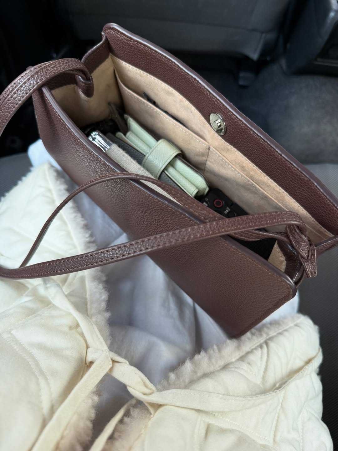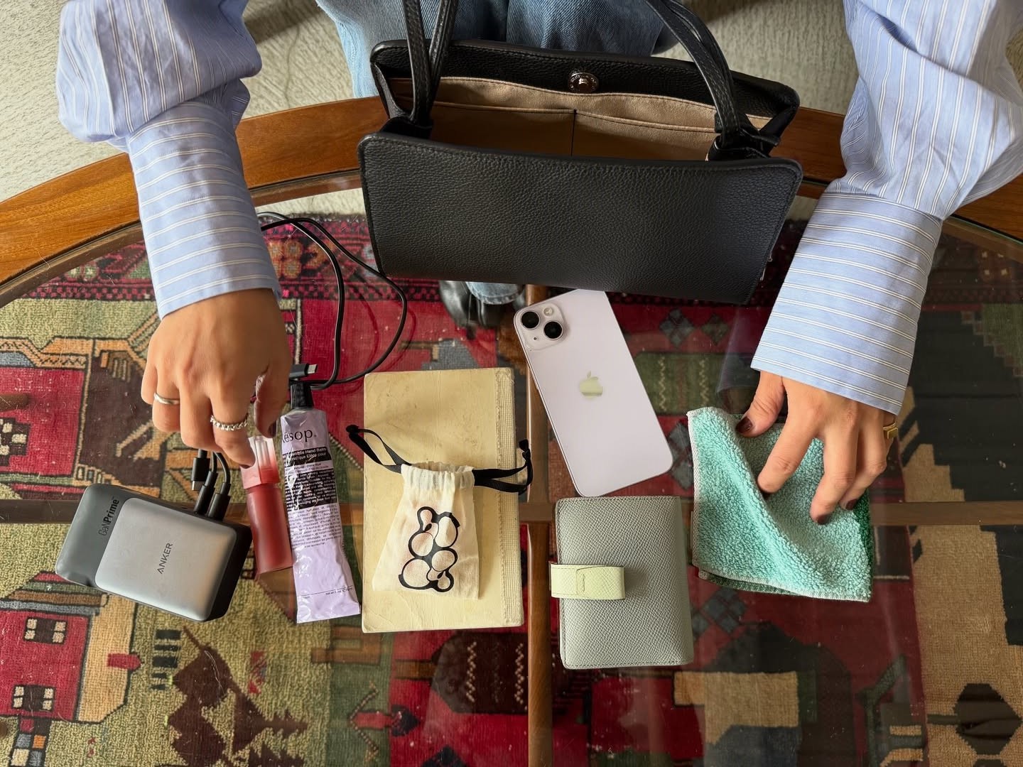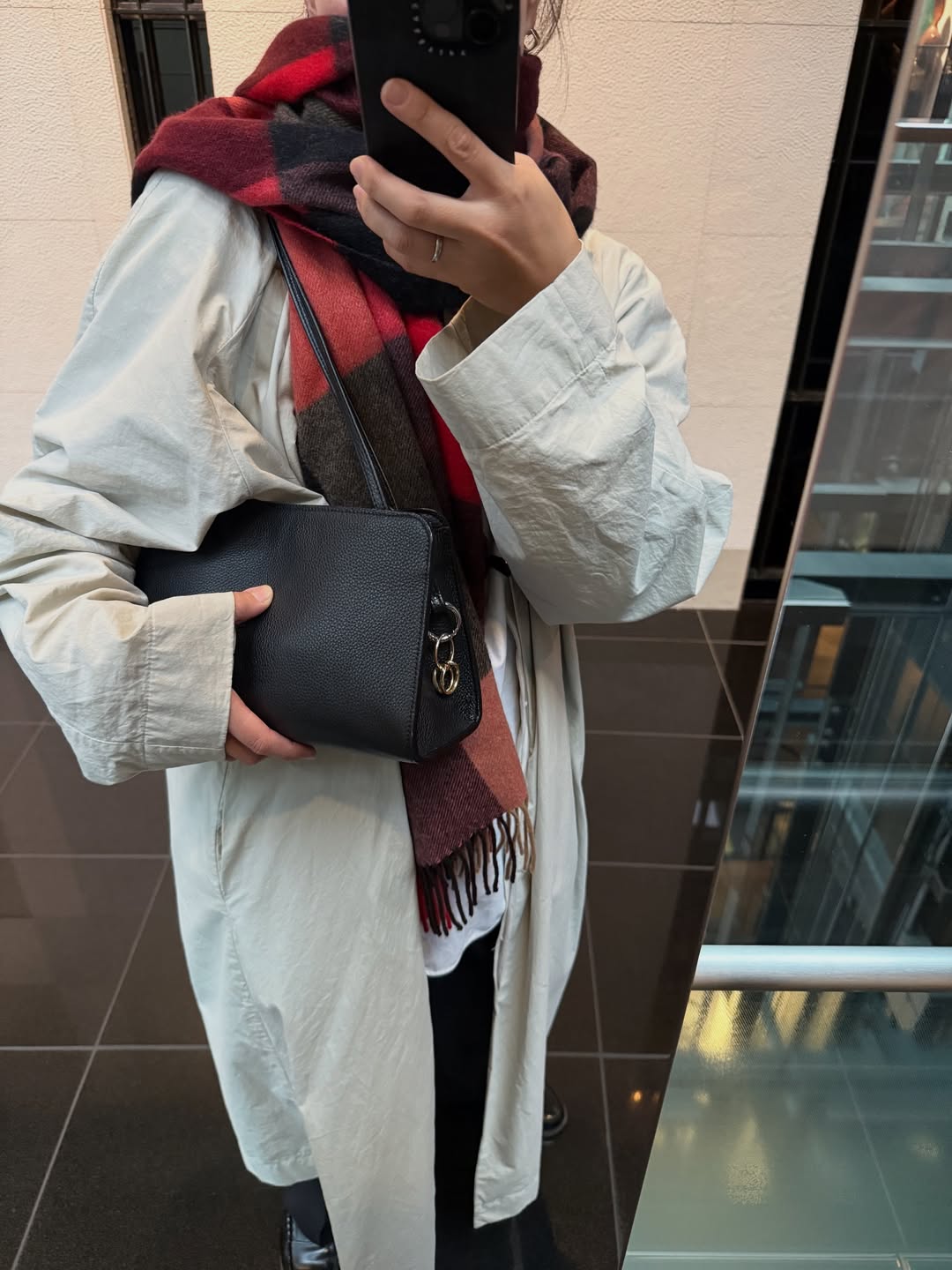 見た目はミニマルなのに、ペットボトルや長財布もしっかり収まる頼もしさがあり、日々の外出にちょうどいいサイズ感です。