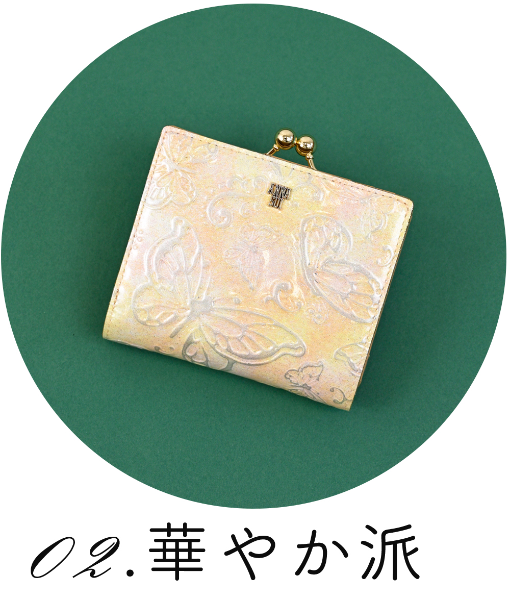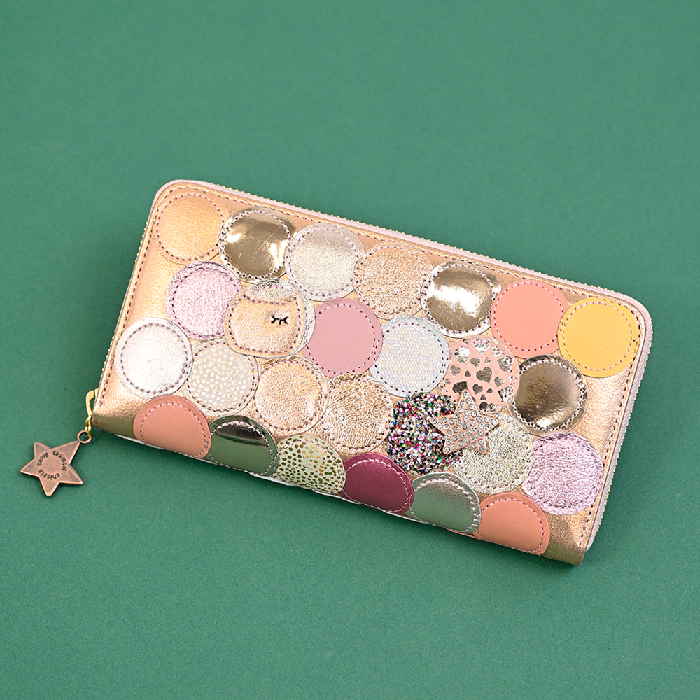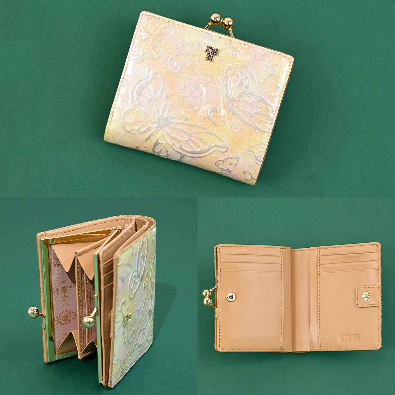 オリジナルのバタフライ柄が目を惹く華やかなお財布。丁寧な加工で生まれた奥行きある表情に、ローズの引き手やラメの煌めきがアクセント。がま口型の小銭入れや収納力もあり、ルックスと機能性がしっかり両立した一品です。