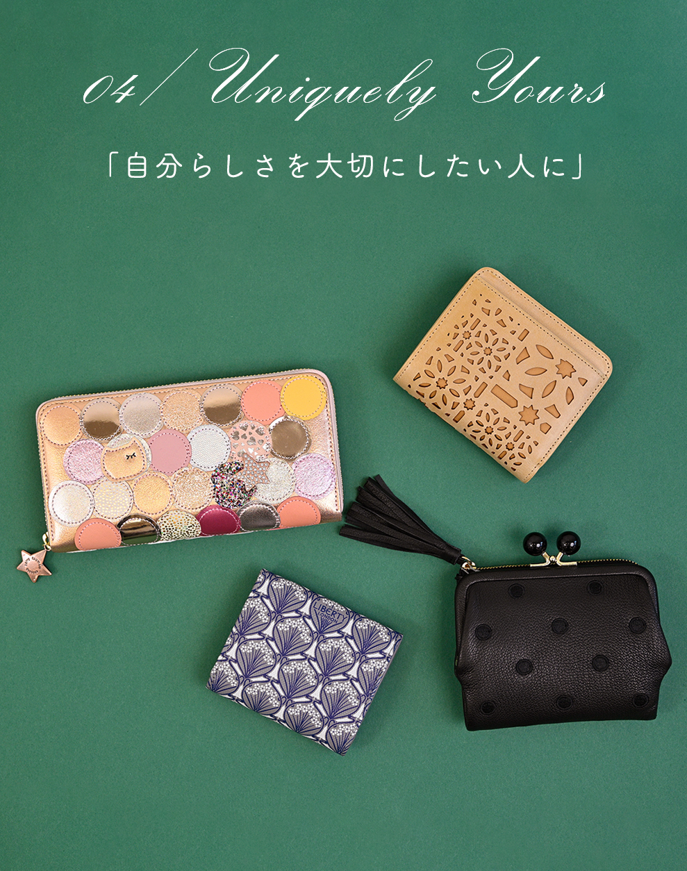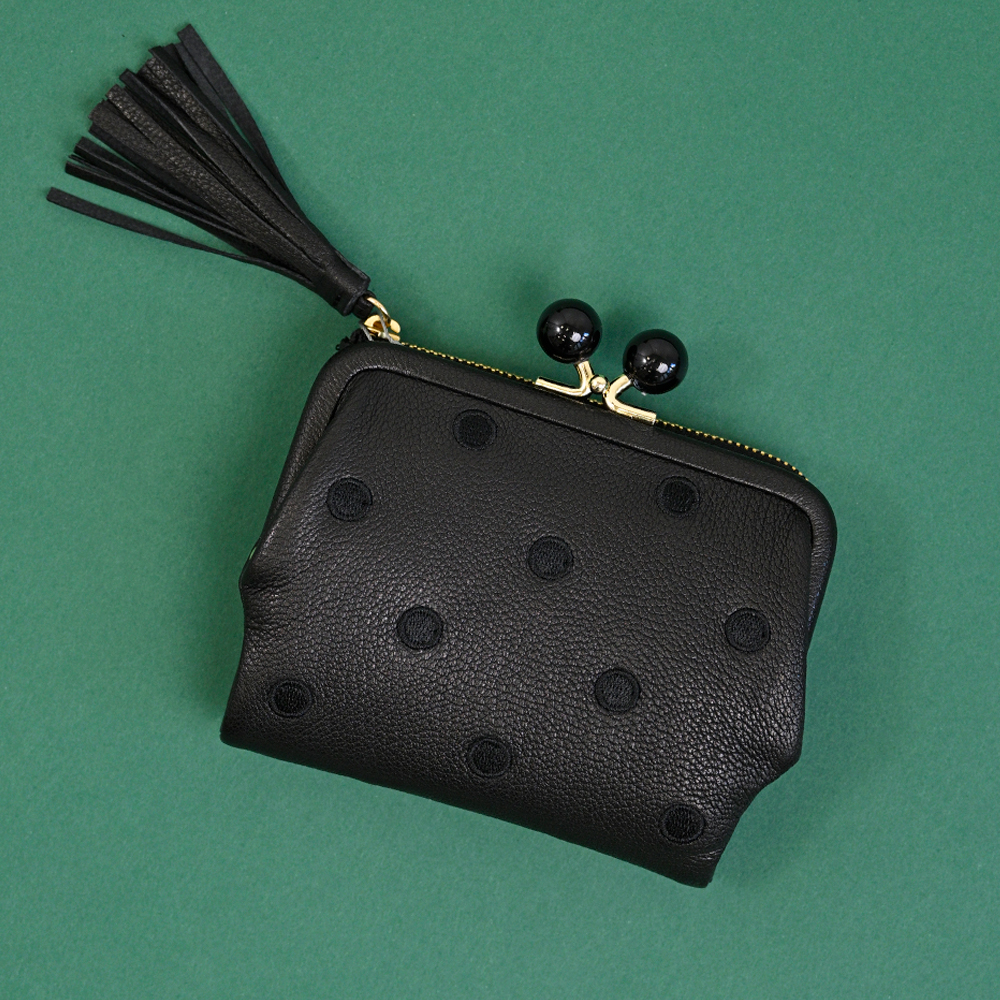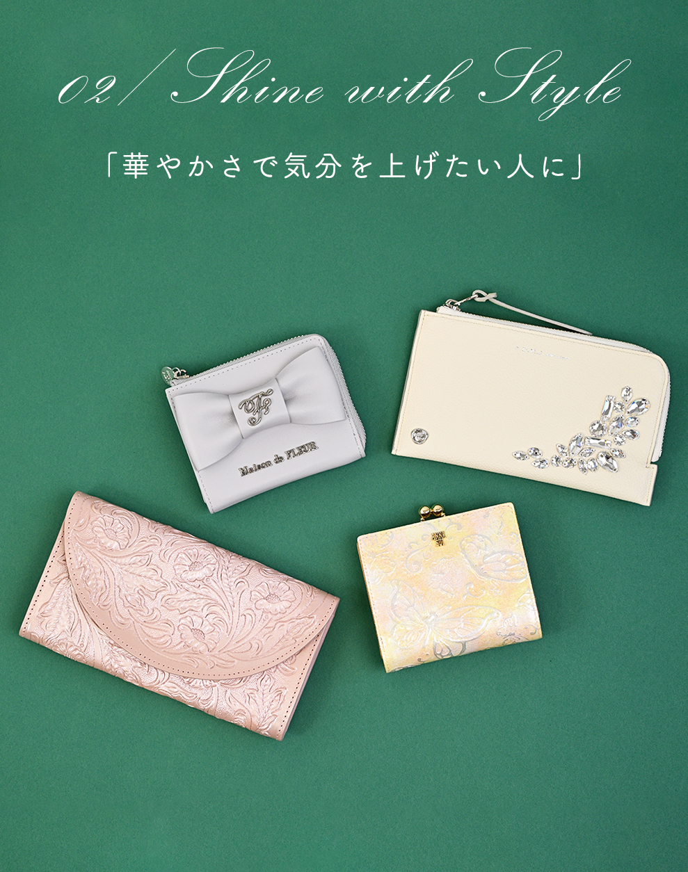 オリジナルのバタフライ柄が目を惹く華やかなお財布。丁寧な加工で生まれた奥行きある表情に、ローズの引き手やラメの煌めきがアクセント。がま口型の小銭入れや収納力もあり、ルックスと機能性がしっかり両立した一品です。