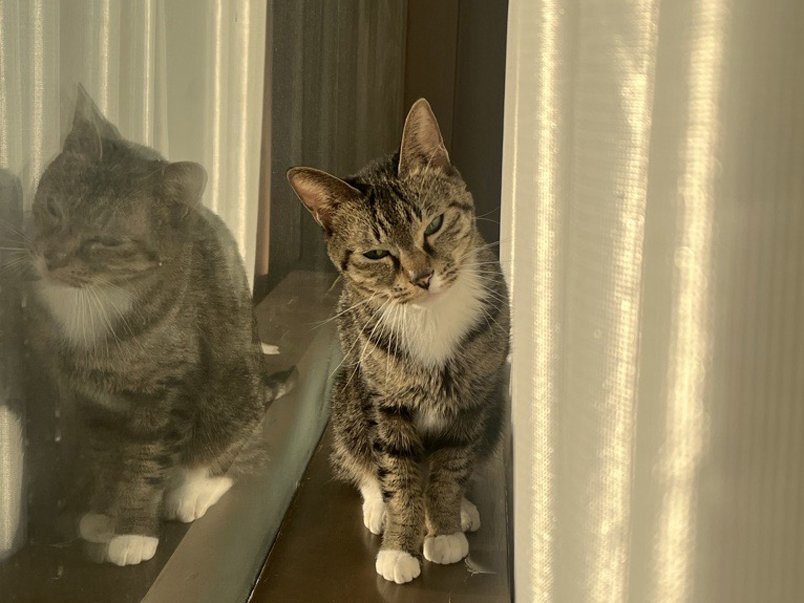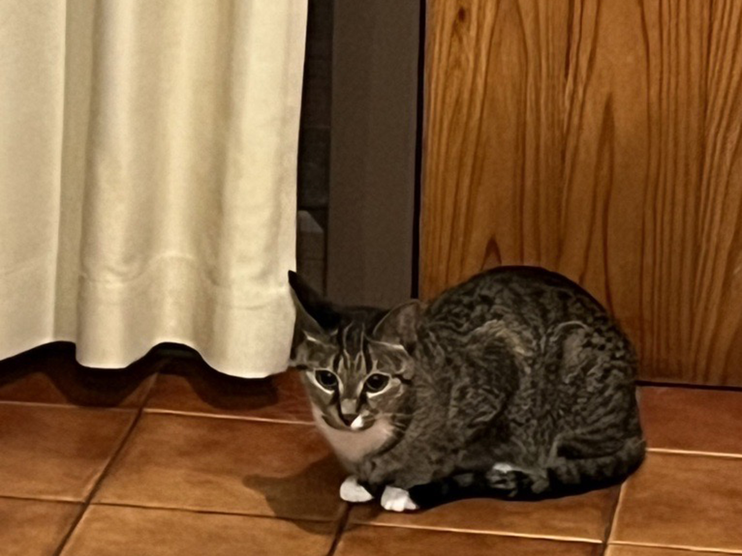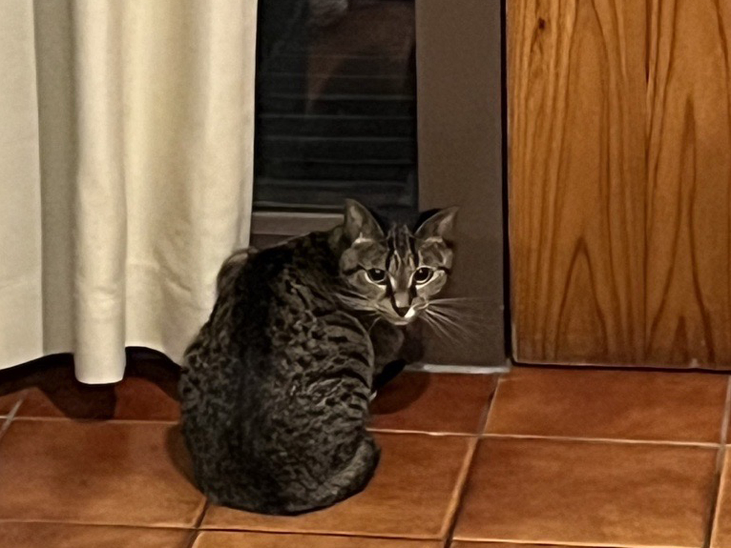 「なに見てるにゃ...」どうしてもお父さんの帰りを待ち切れないようです。