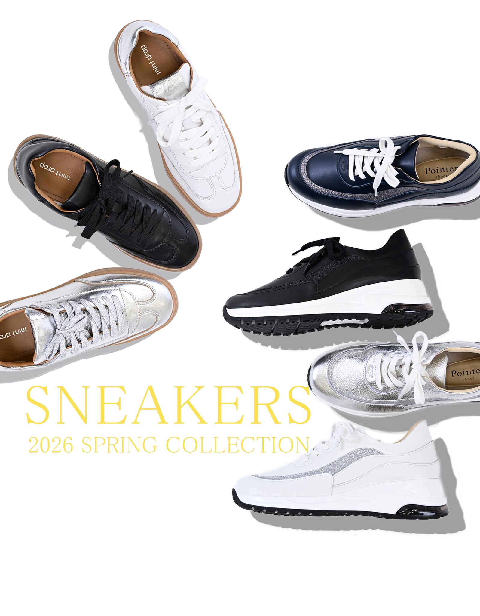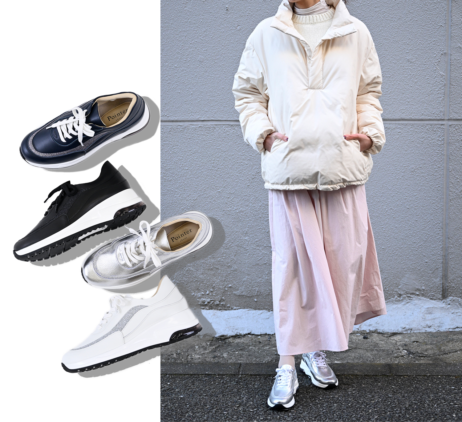 4.5cmの厚底でさりげなくスタイルアップ。グリッターを効かせたシルバーが、淡いピンクのスカートと響き合い、春らしく華やかな足元を演出します。人気NO.1のスニーカーです。