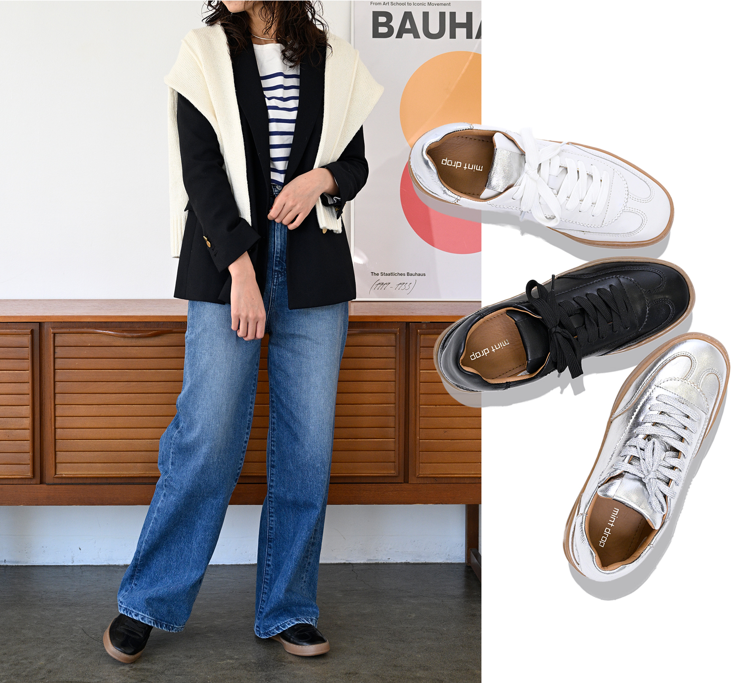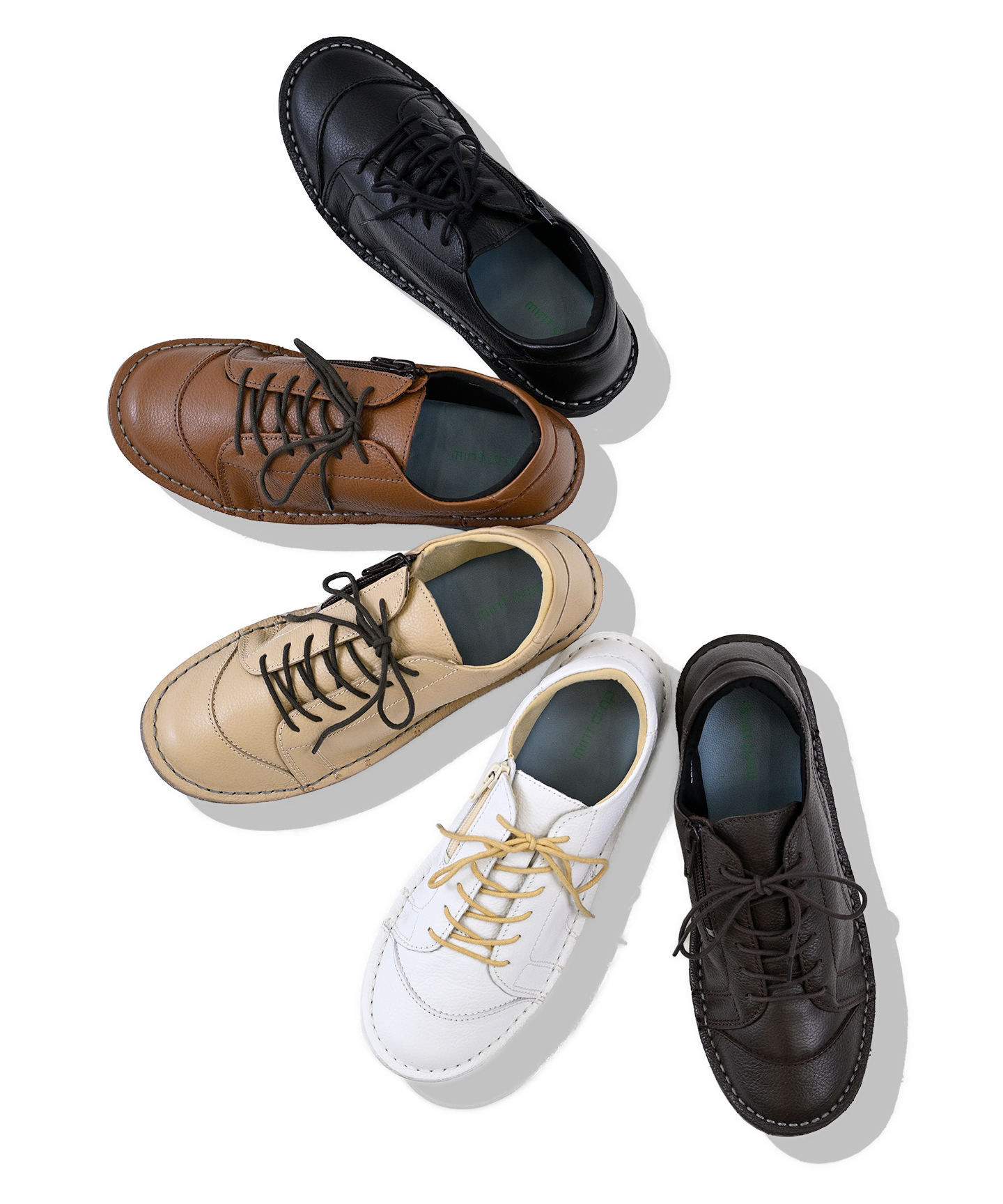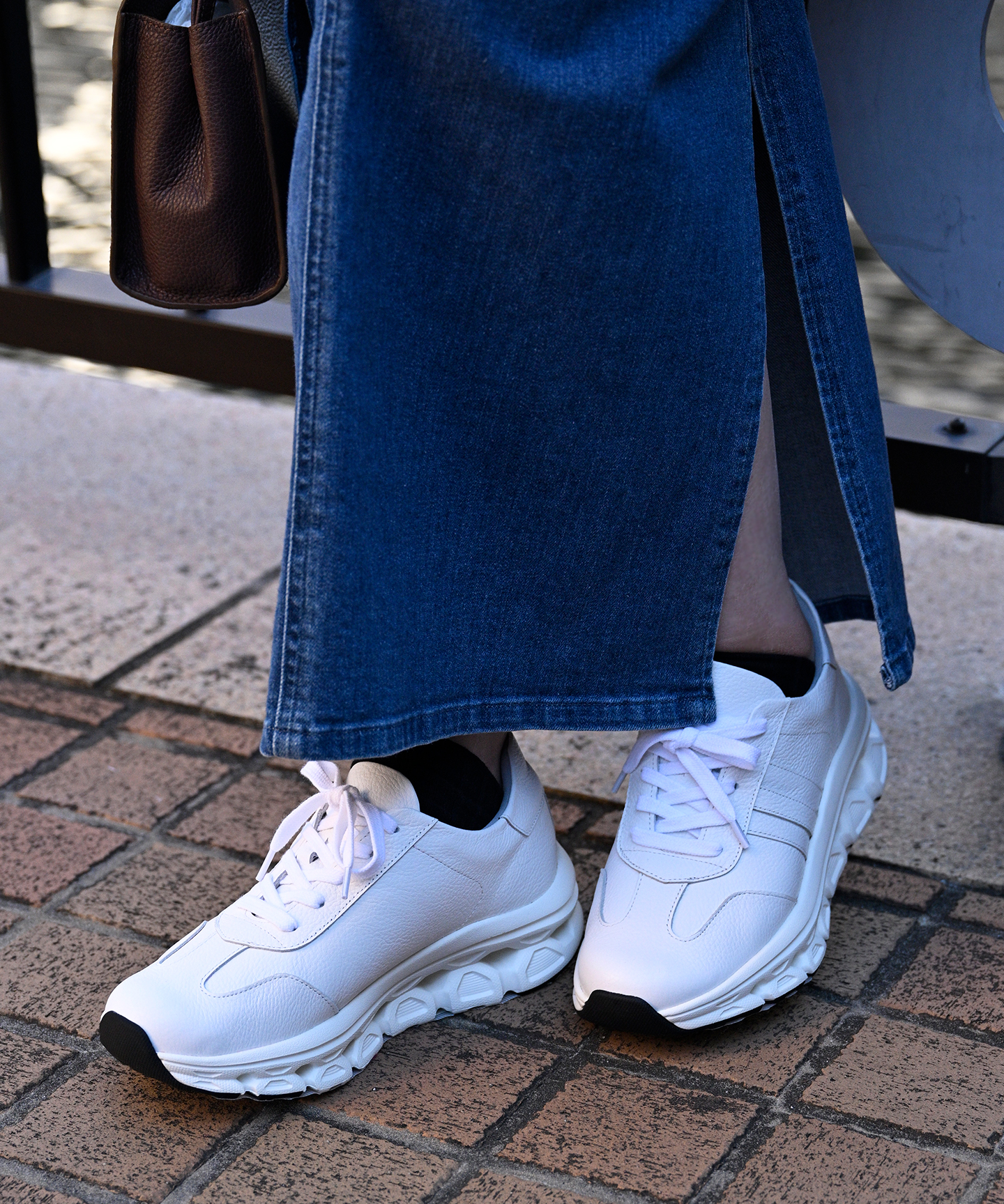 どんな装いにもなじむシンプルさに、軽量ソールの心地よさを添えて。ミントグリーンと白のクリーンなスタイリングで、春の足元を軽やかに。