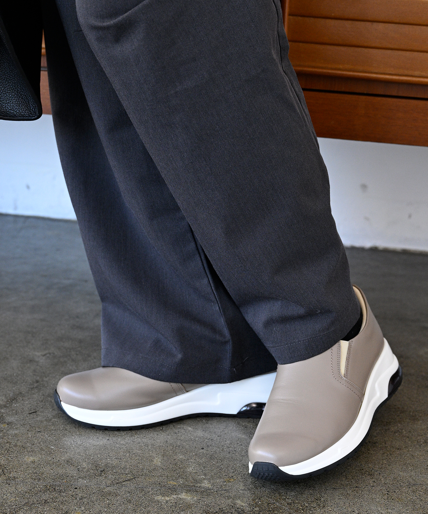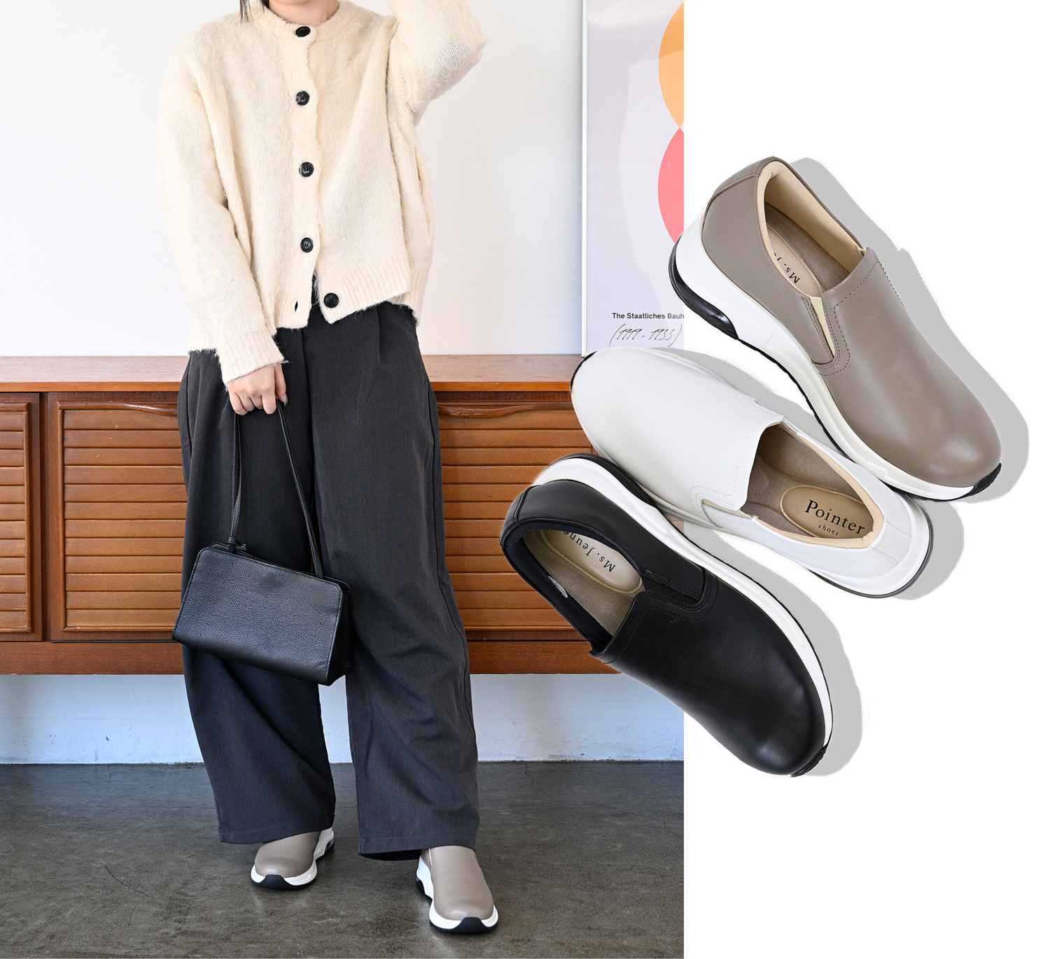 足をやさしく包み込む本革スリッポンは、両手を使わずさっと履けるのも魅力。白のカーディガンにベージュを合わせて、春らしくやわらかな足元に。