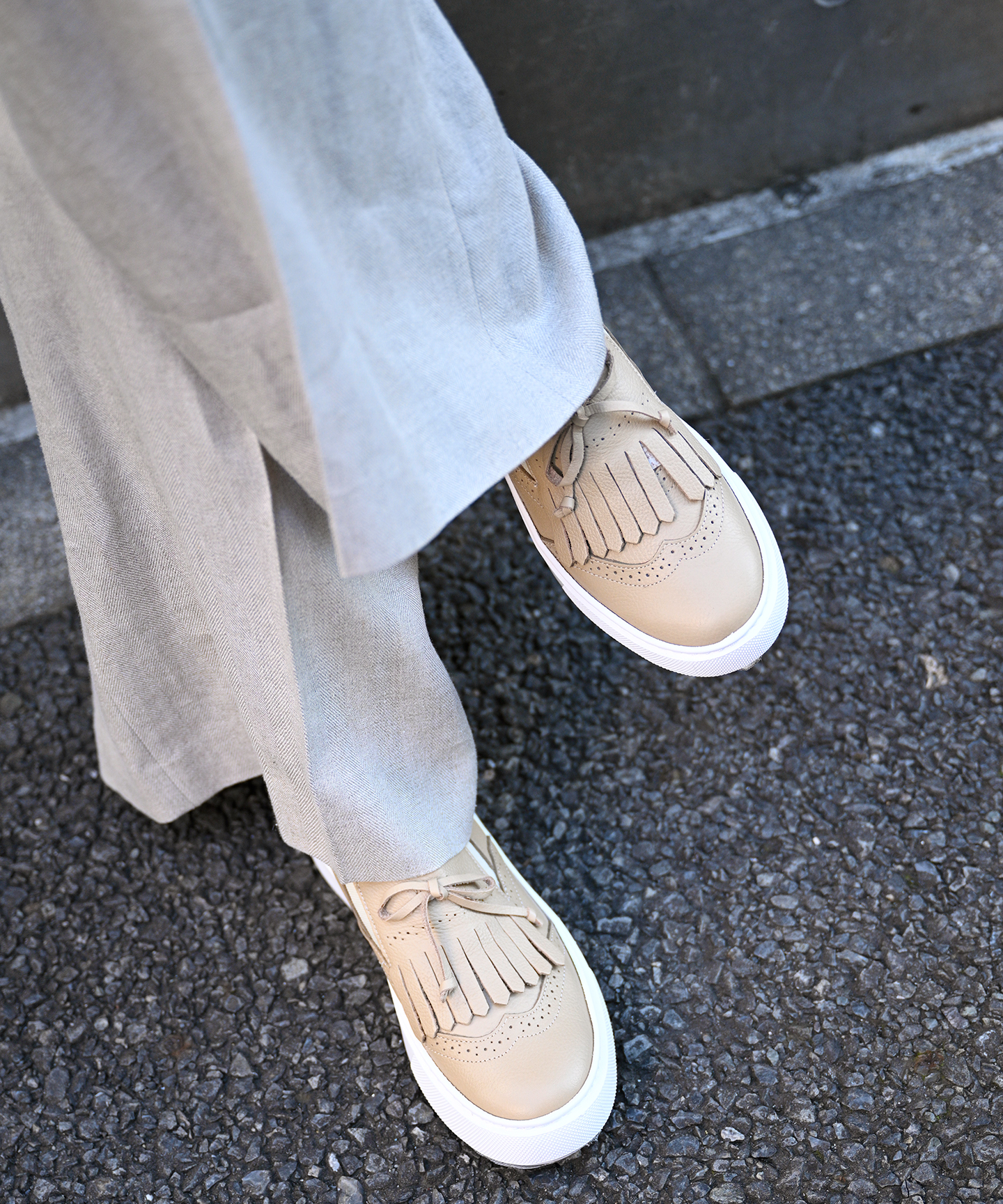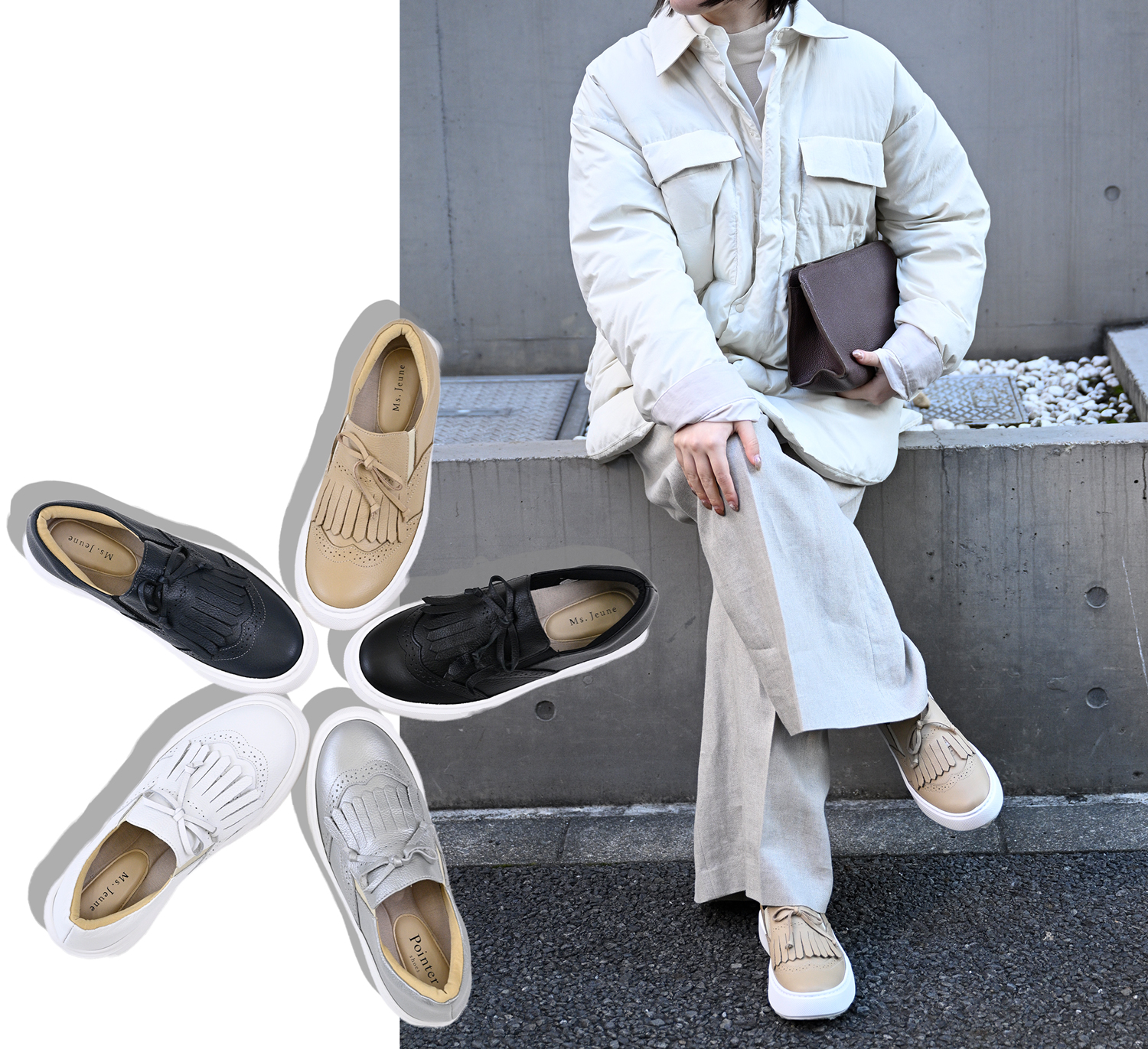 メダリオンとタッセルのトラッド感を、スポーティに、そしてリボンでフェミニンに昇華。控えめな厚底が大人の足元をすっきり見せ、ベージュ×白の春配色に軽やかなスタイルアップを添えます。