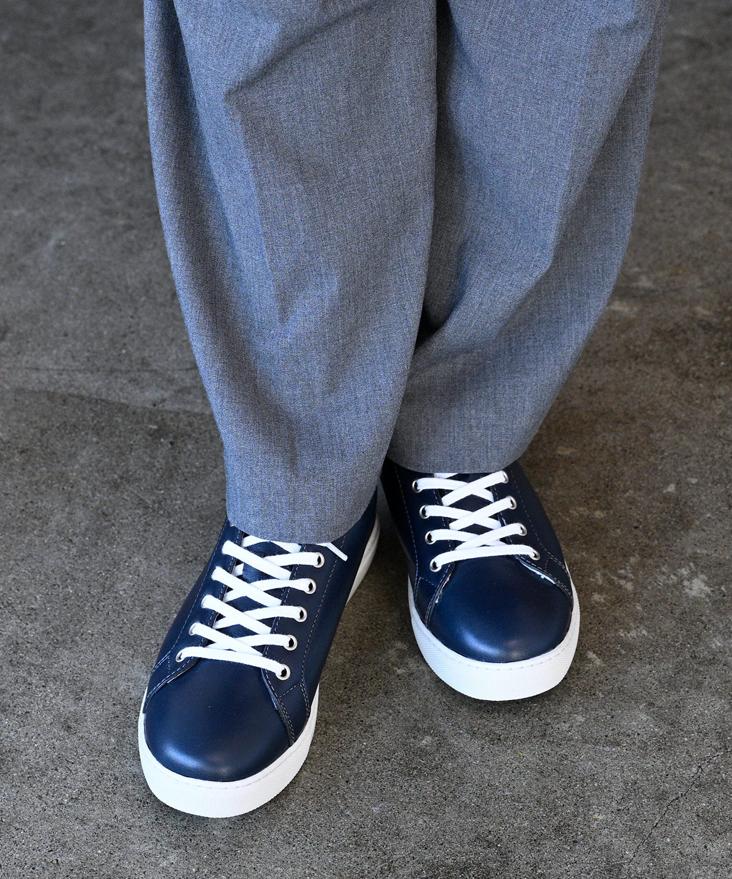 やさしい春色コーデに、ネイビーのシンプルスニーカーで上品な引き締めを。ふかふかの立体カップインソールが長時間の外出も支え、季節を問わず頼れる一足に。