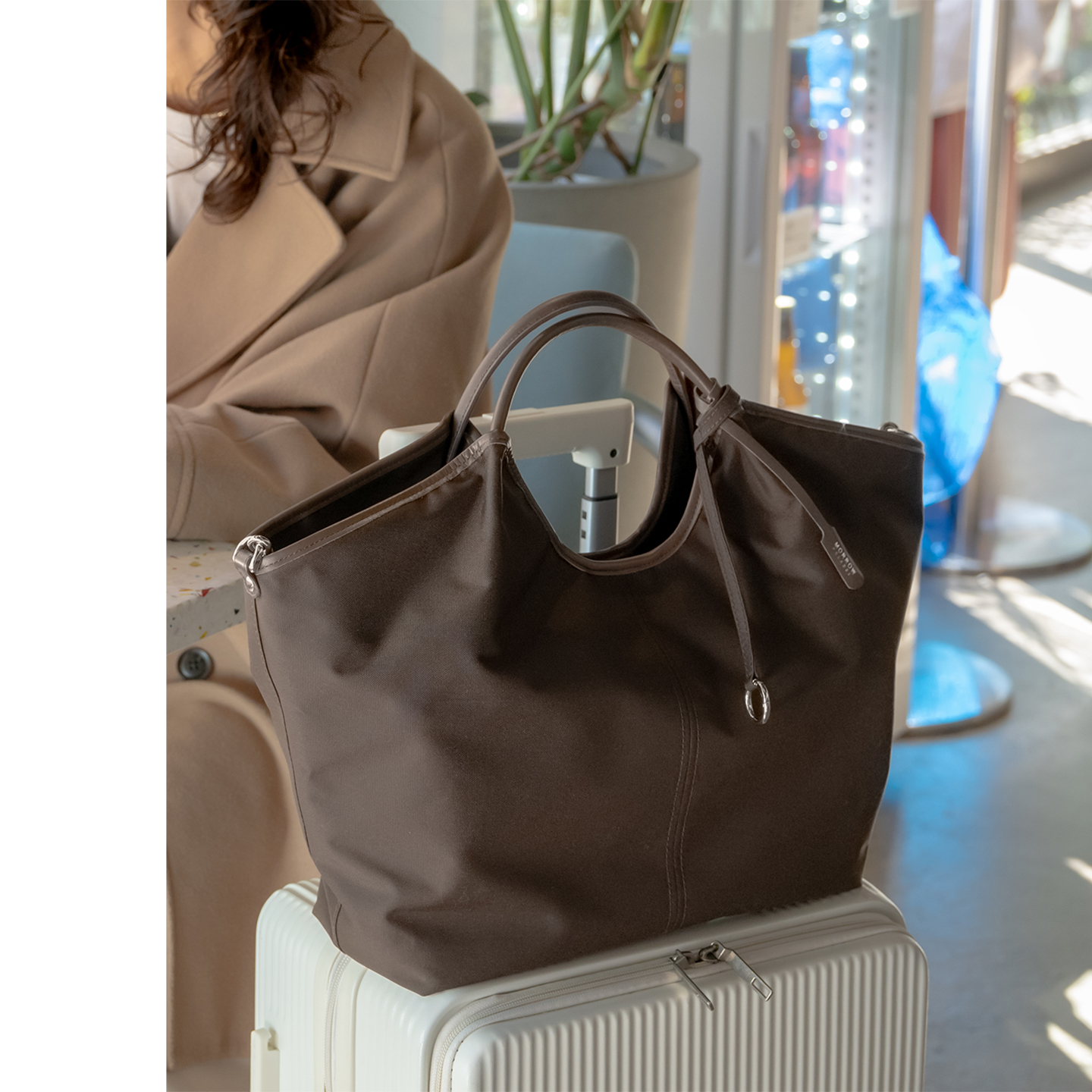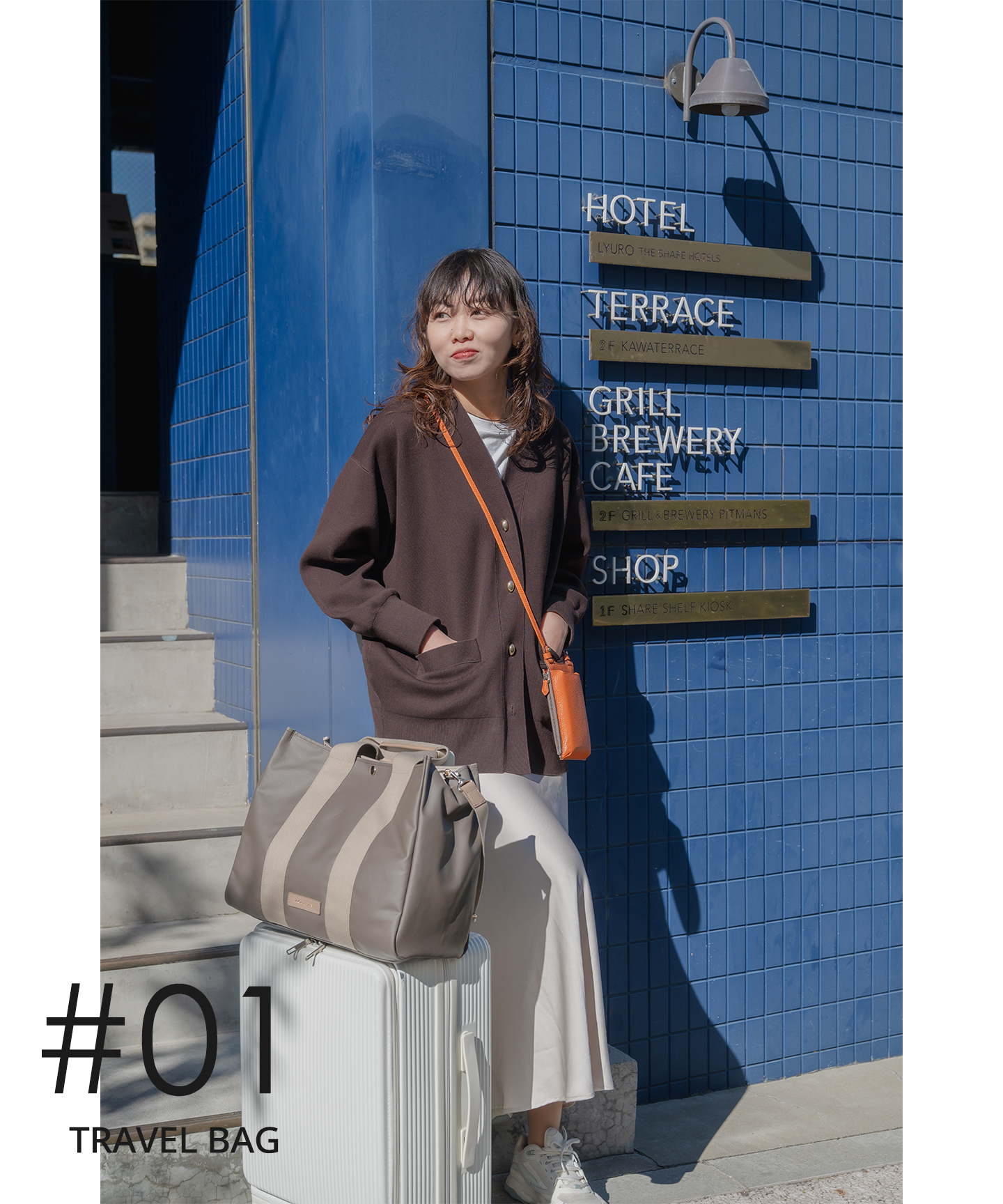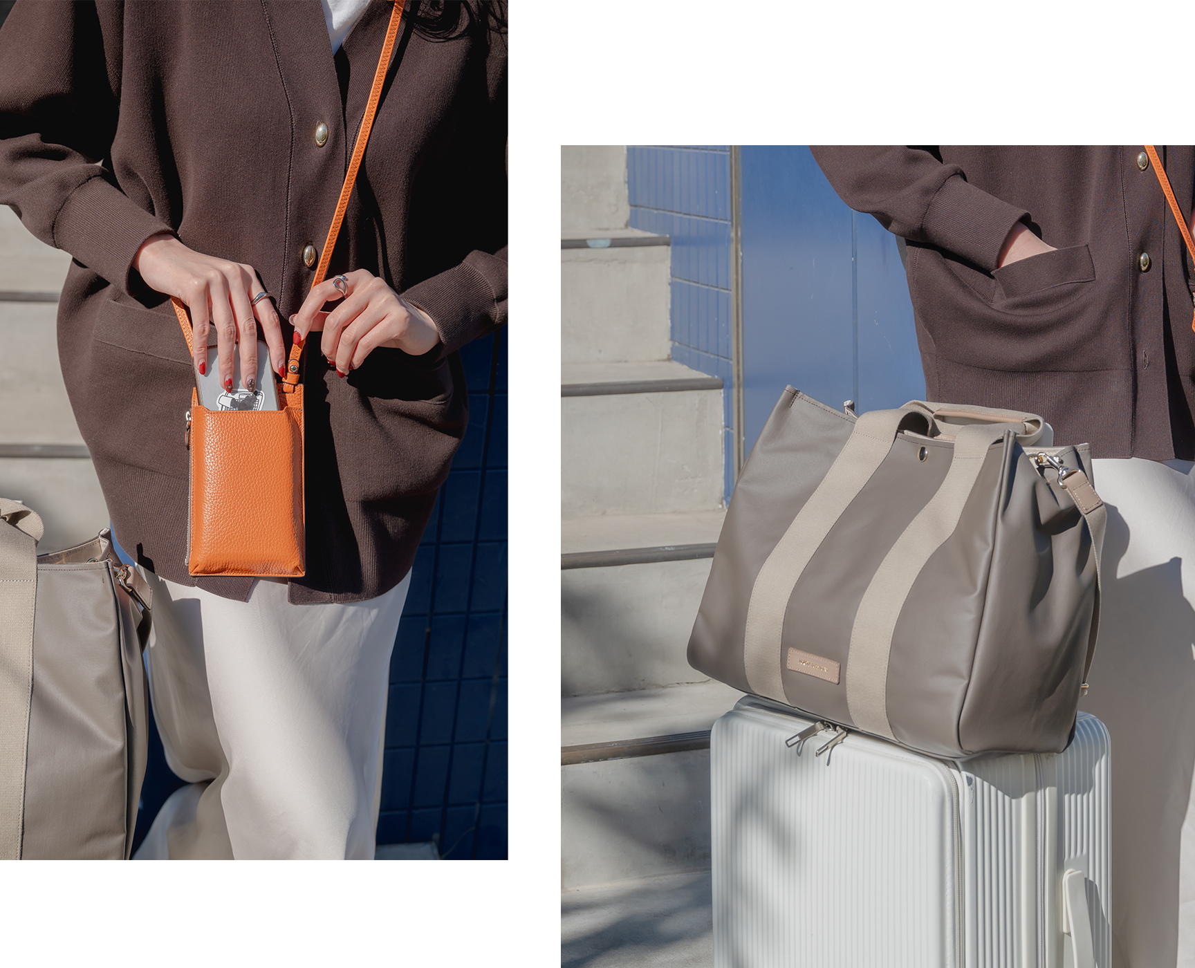 コンパクトなショルダーバッグは携帯が出し入れしやすく、両手が空いて持ち歩きに便利。 キャリーの上に置くのにも丁度いいトートバッグは、キレイ見えなのに大容量で扱いやすさも抜群です。