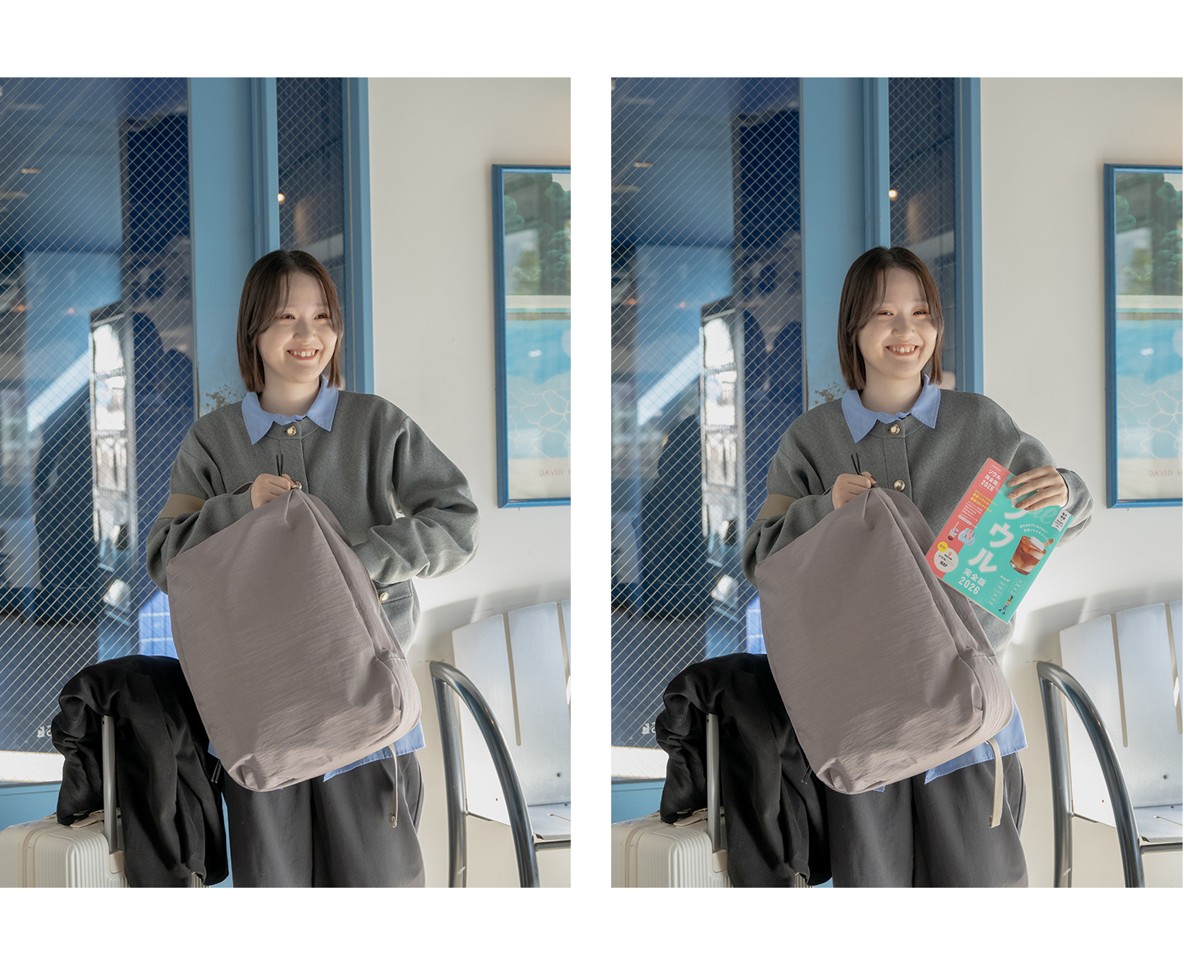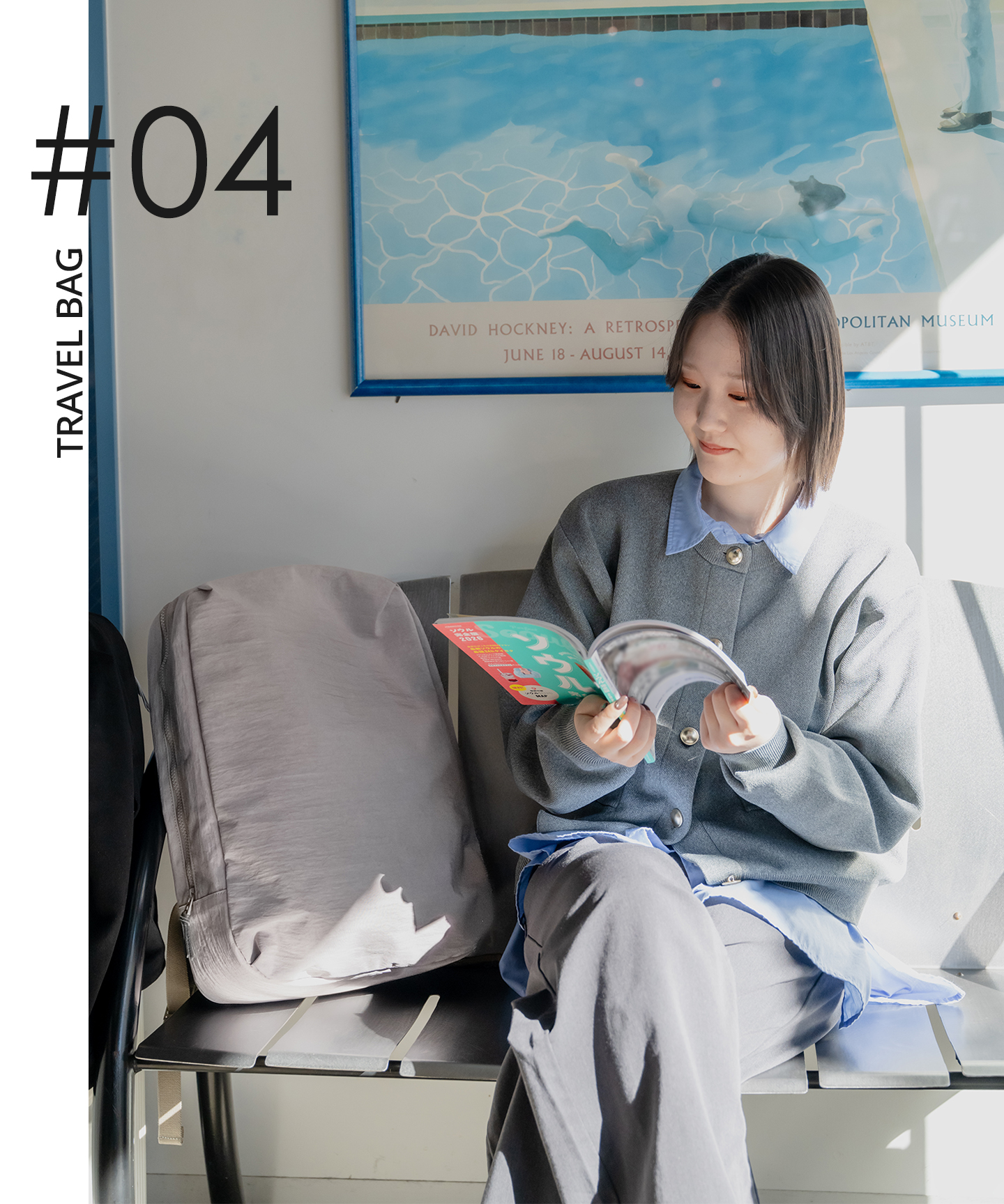 待ち時間。旅行誌を見ながら、この後どこに行く? あれもこれもと荷物が多くなりがちな旅にはたっぷり容量のあるバッグパックをお供に。