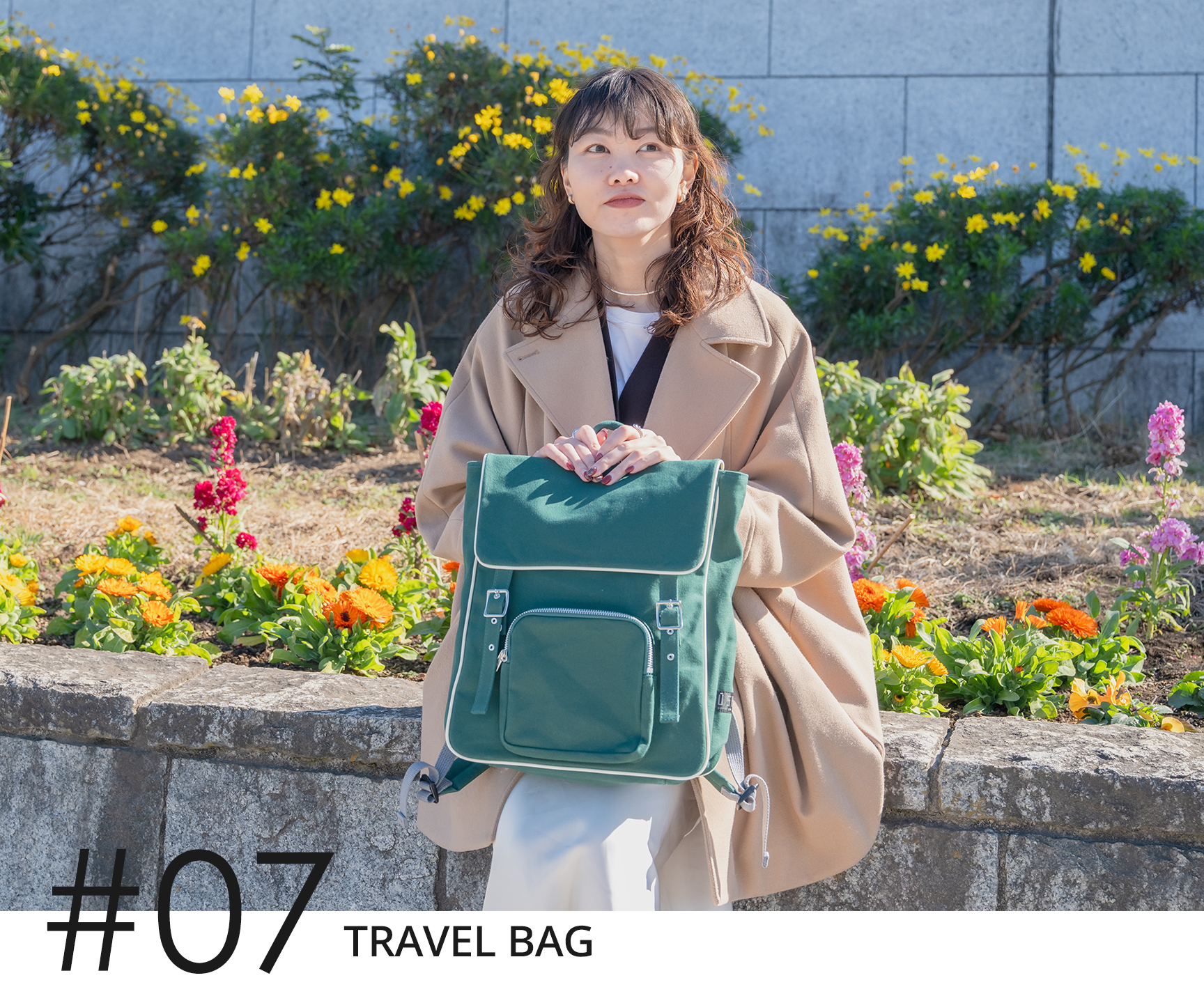 手触りが優しい帆布のバッグは、グリーンを効かせて。 細かく分けられたポケットや持ち手の使い勝手のよさが◎
