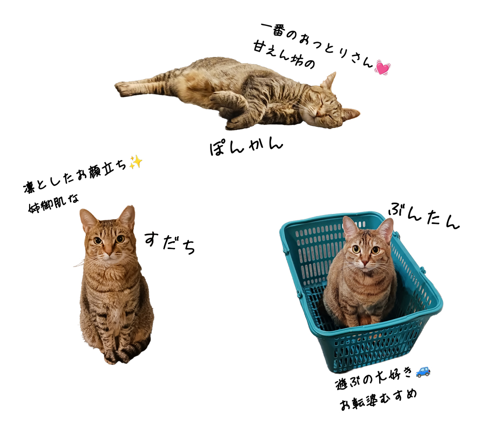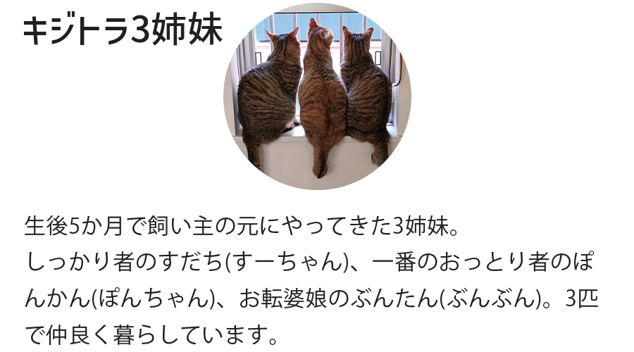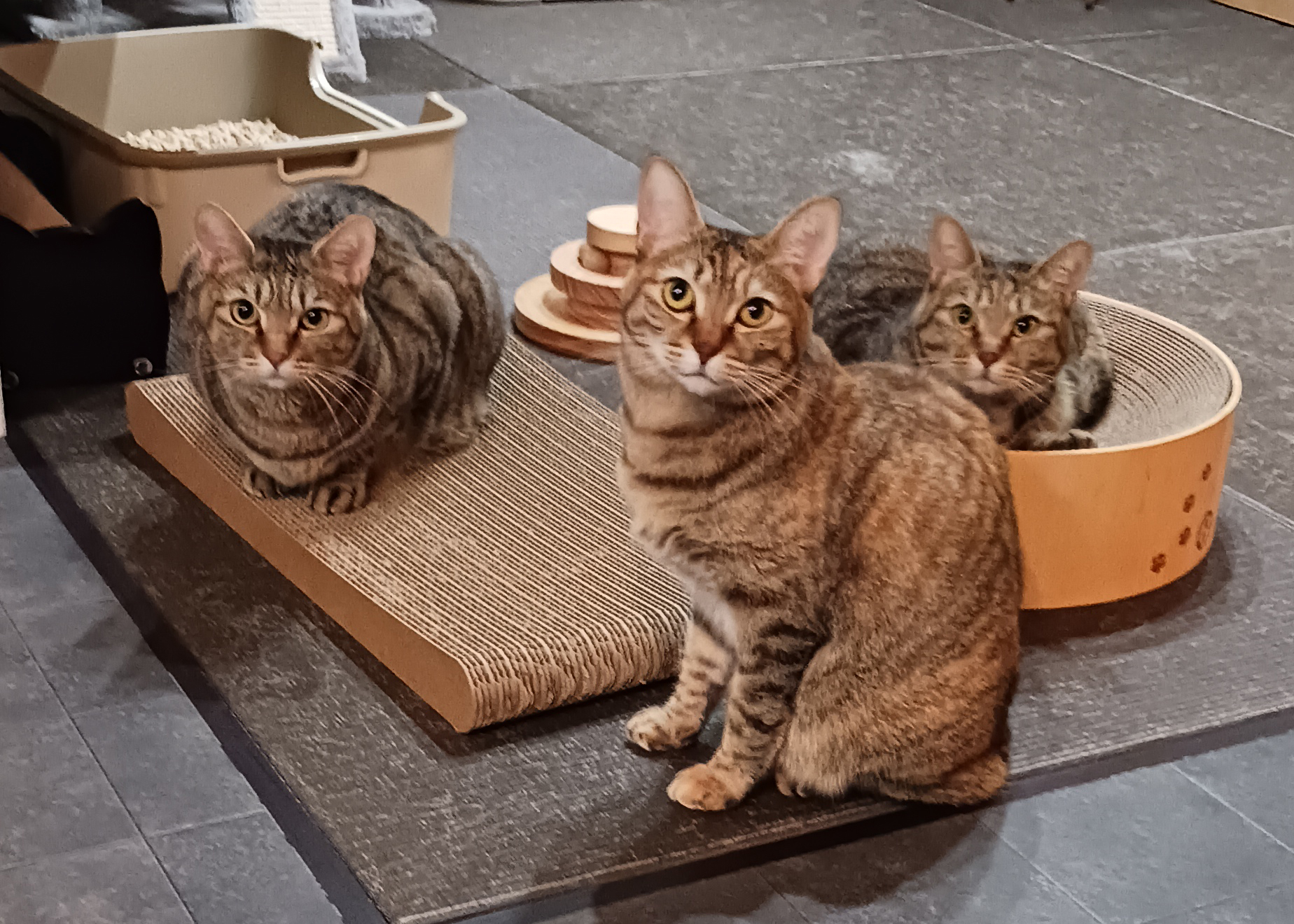 飼い主さんに見守られながら暮らす、キジトラ3姉妹です。