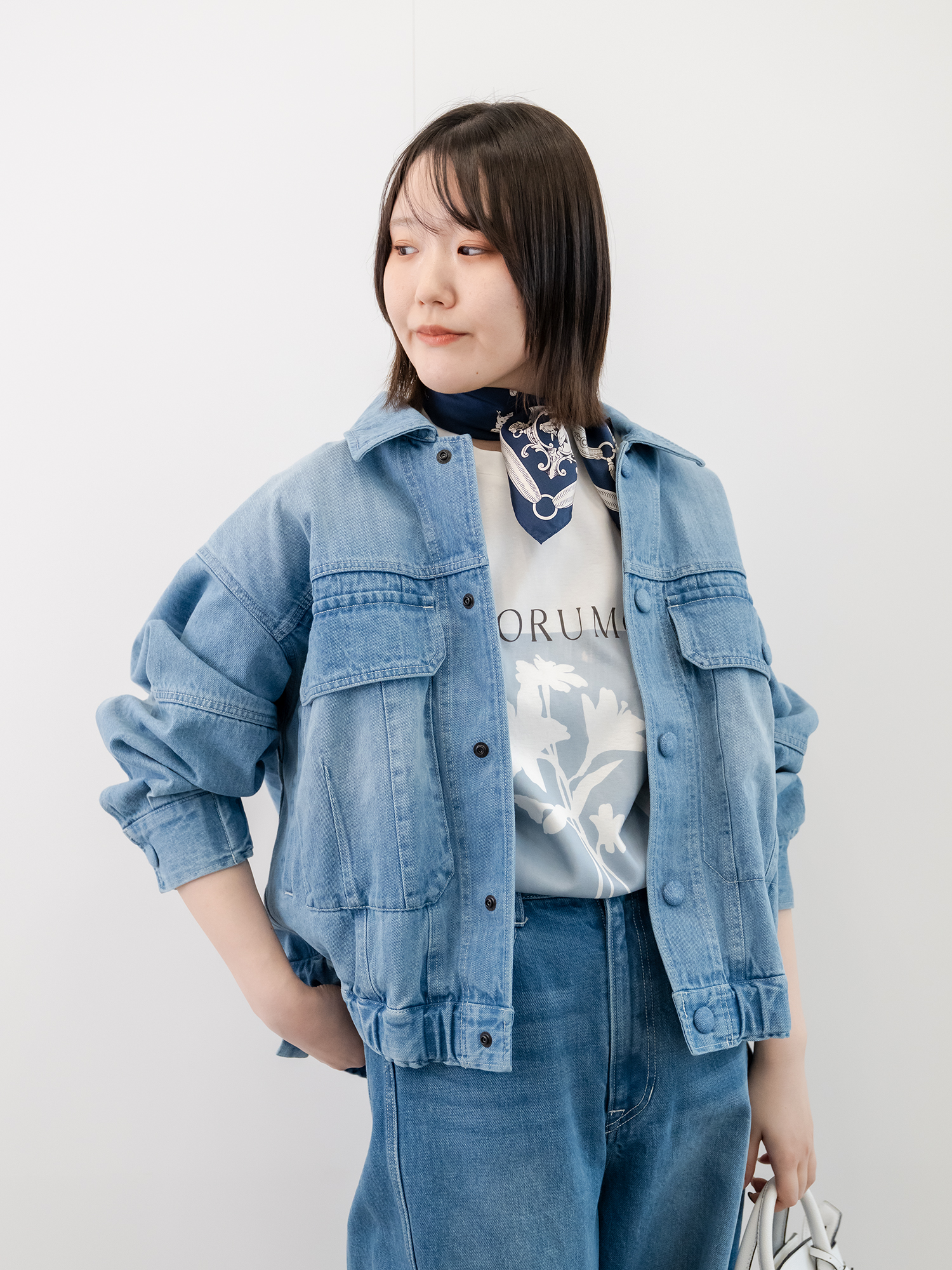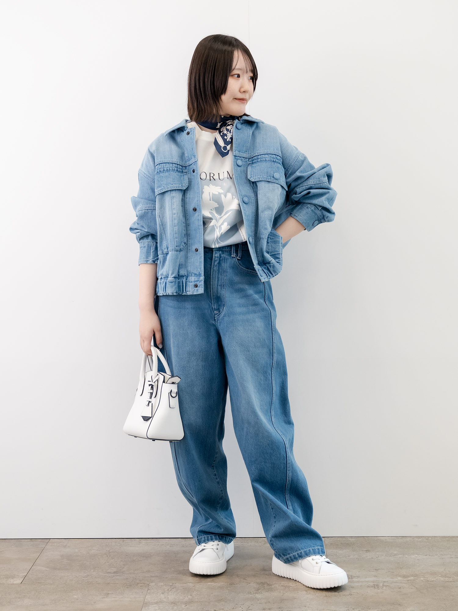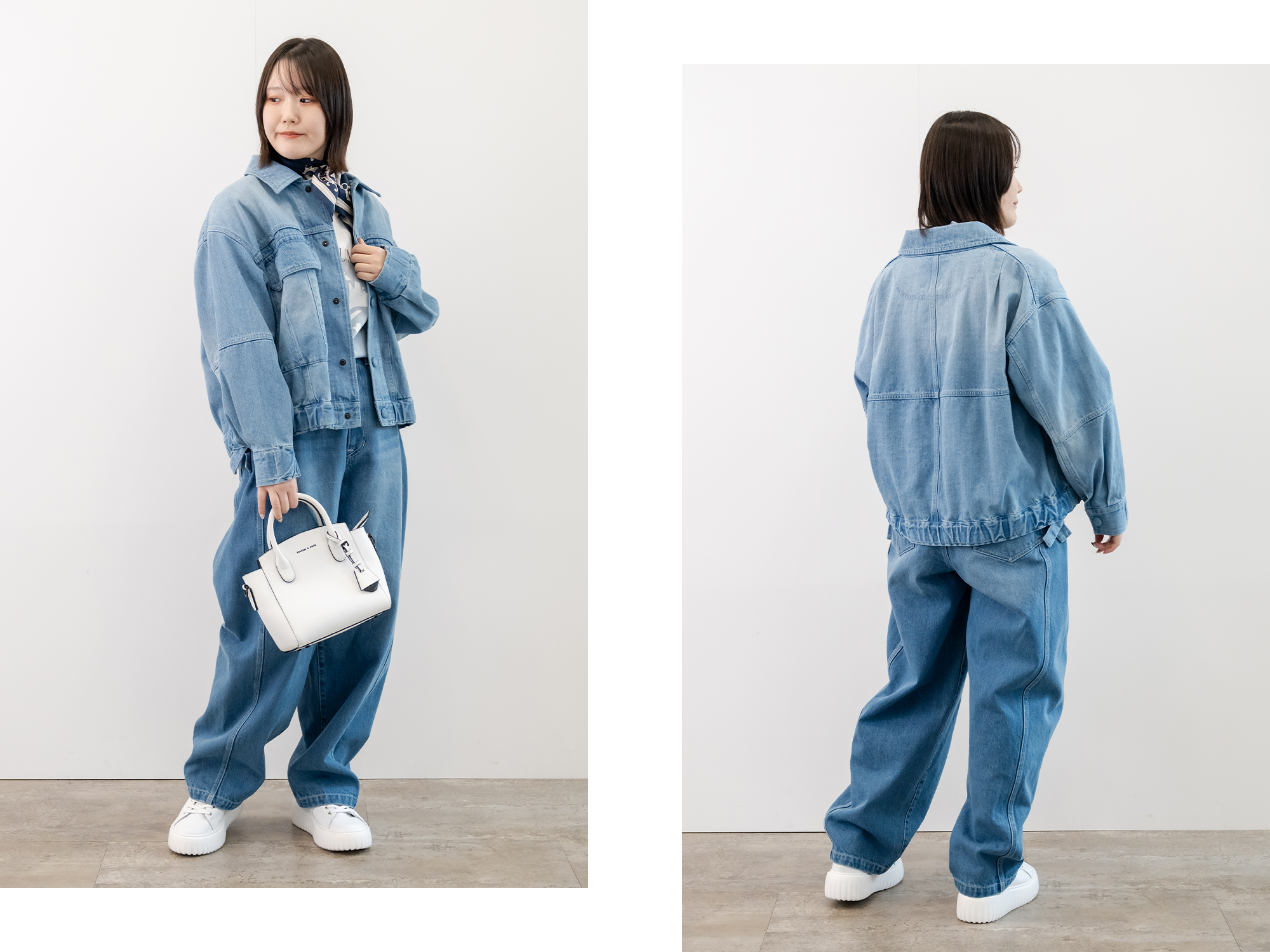 春らしいライトなブルーのデニムオンデニムコーデ。カジュアルな雰囲気の中に、どことなく上品さを感じられるようなシルエットやディテールが特徴的。