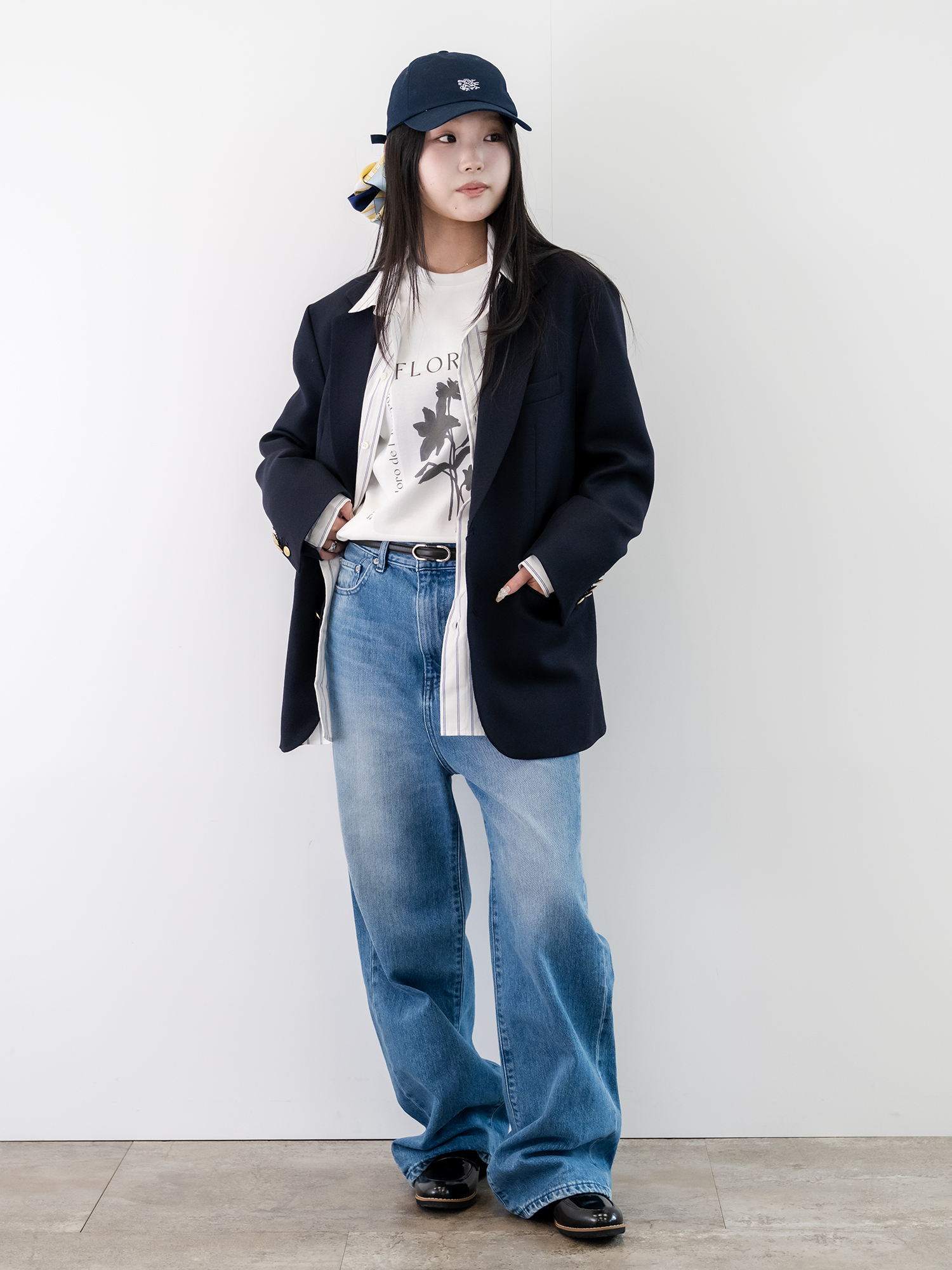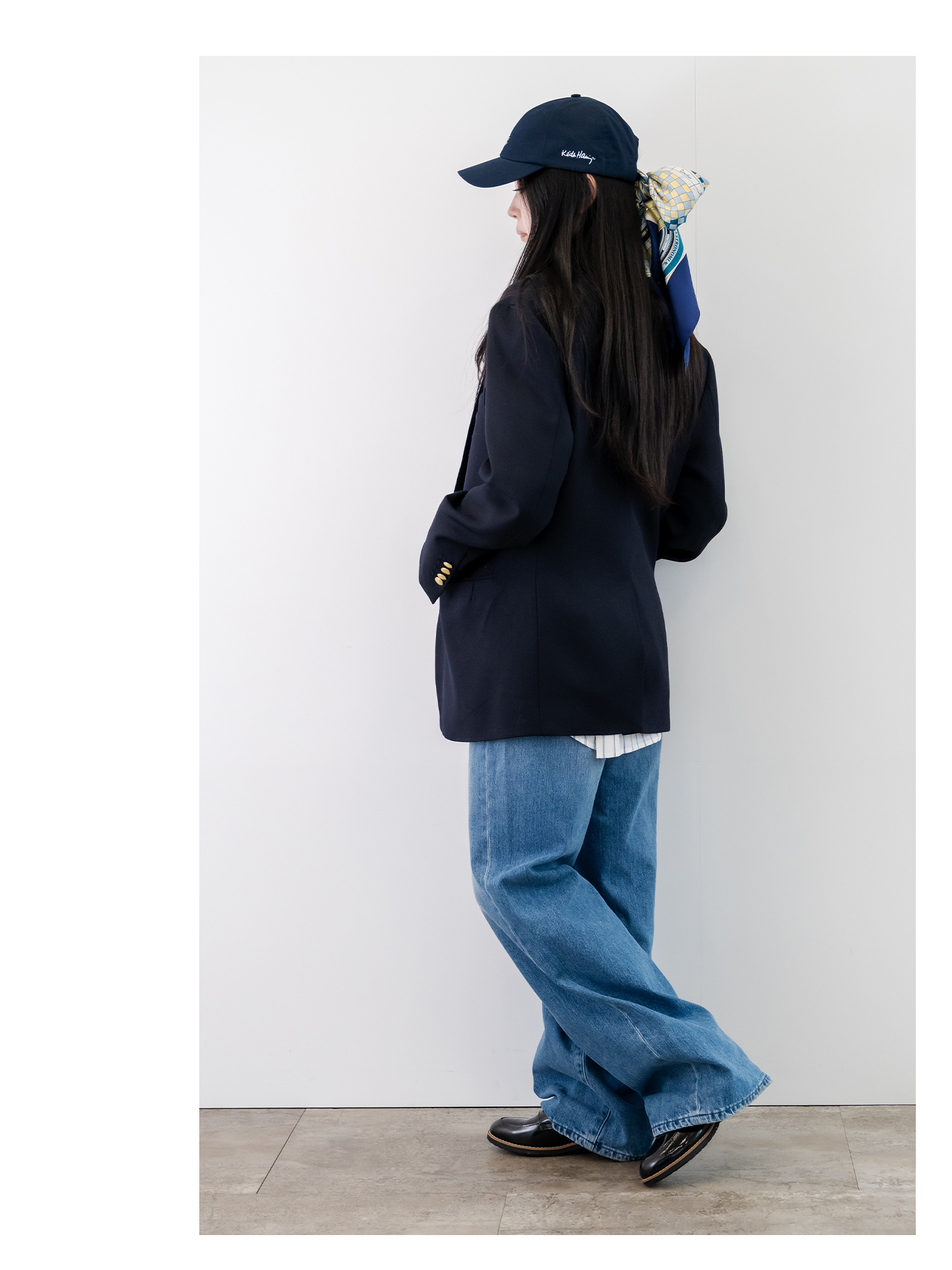 キレイめテーラードジャケットにカジュアルなストレートデニムを合わせたMixスタイリング。お堅くなりすぎないようキャップを被ると、マニッシュな見た目に。