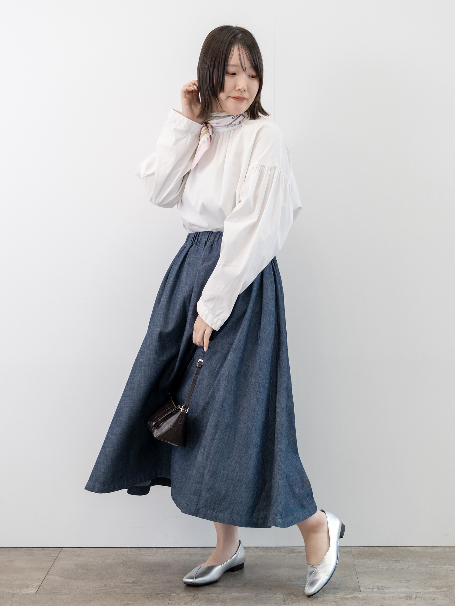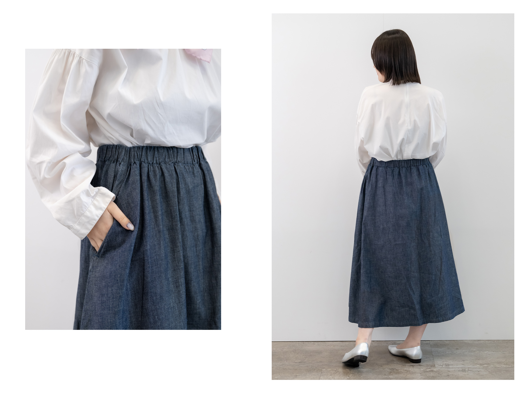 女性らしさ際立つウエスト総ゴムのデニムスカート。たっぷりギャザーでAラインシルエットなので上品に穿くことができます。地味に嬉しい2ポケット仕様。