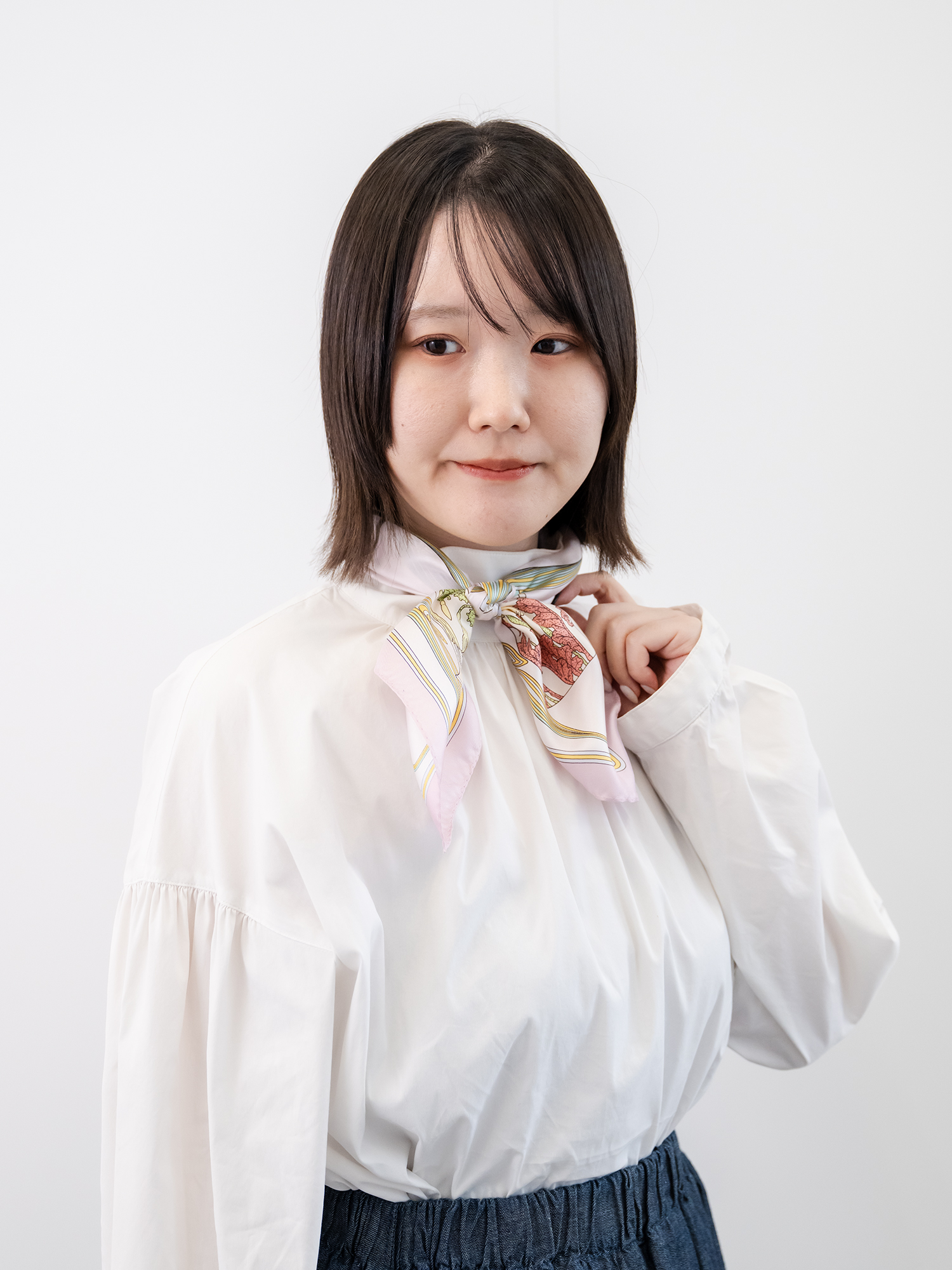 白ブラウスと紺のデニムスカートを引き締めてくれるスカーフ。スカーフのピンクが春らしさを演出してくれます。