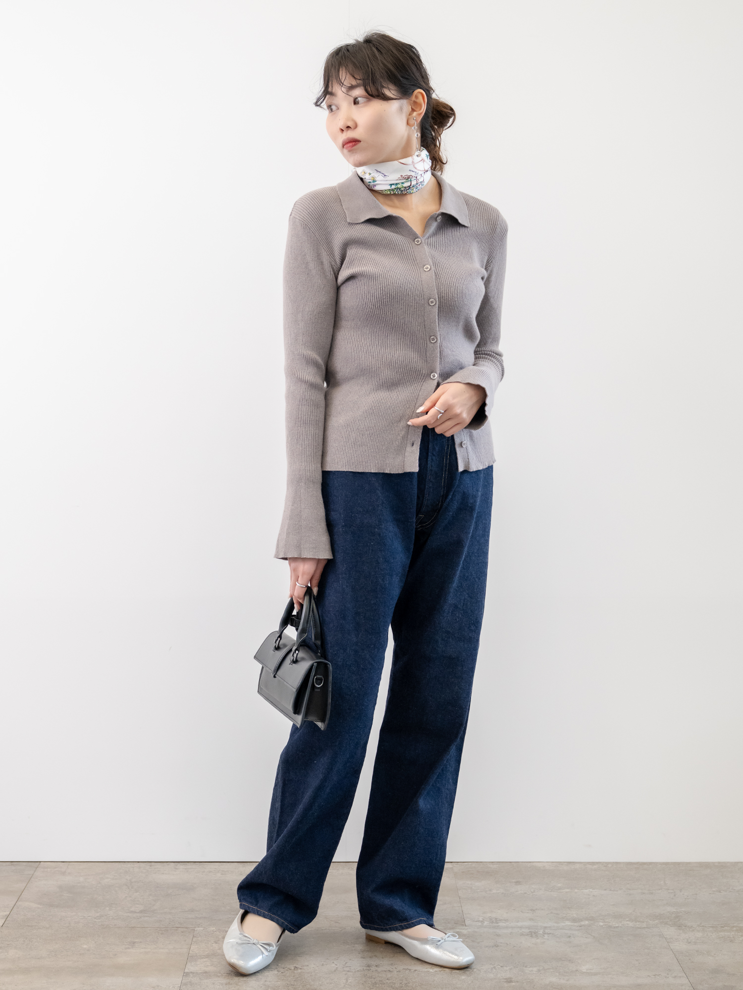 女性らしさを引き立てるハイウエストのデニムパンツとニットのシンプルな組み合わせ。定番カラー、シルエットなのでクローゼットに一本あると何かと便利な万能デニムです。