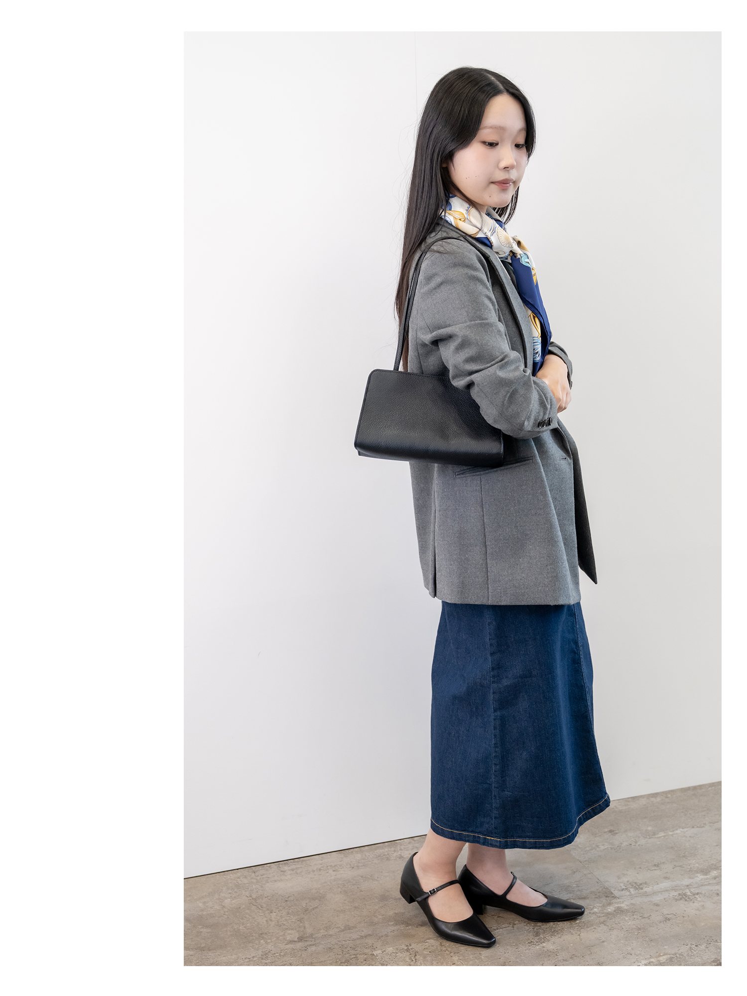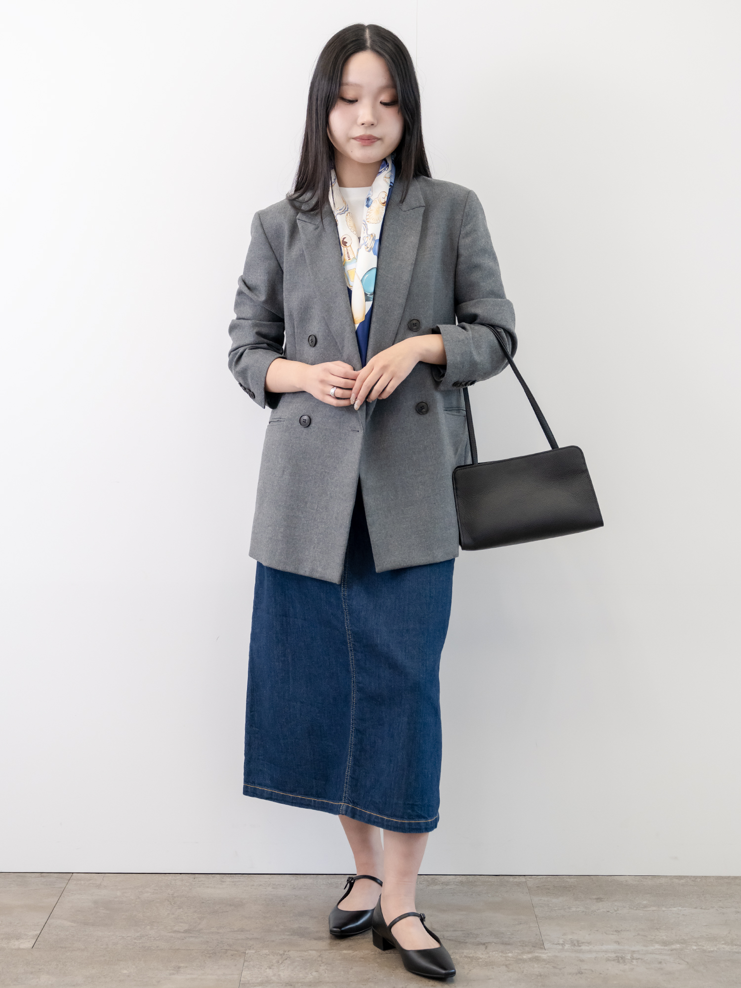短すぎず長すぎない、ちょうど良い丈感のデニムスカートをグレーのテーラードジャケットとキレイに纏う。デニムだけど上品に見えるように工夫されたシルエットがポイント。