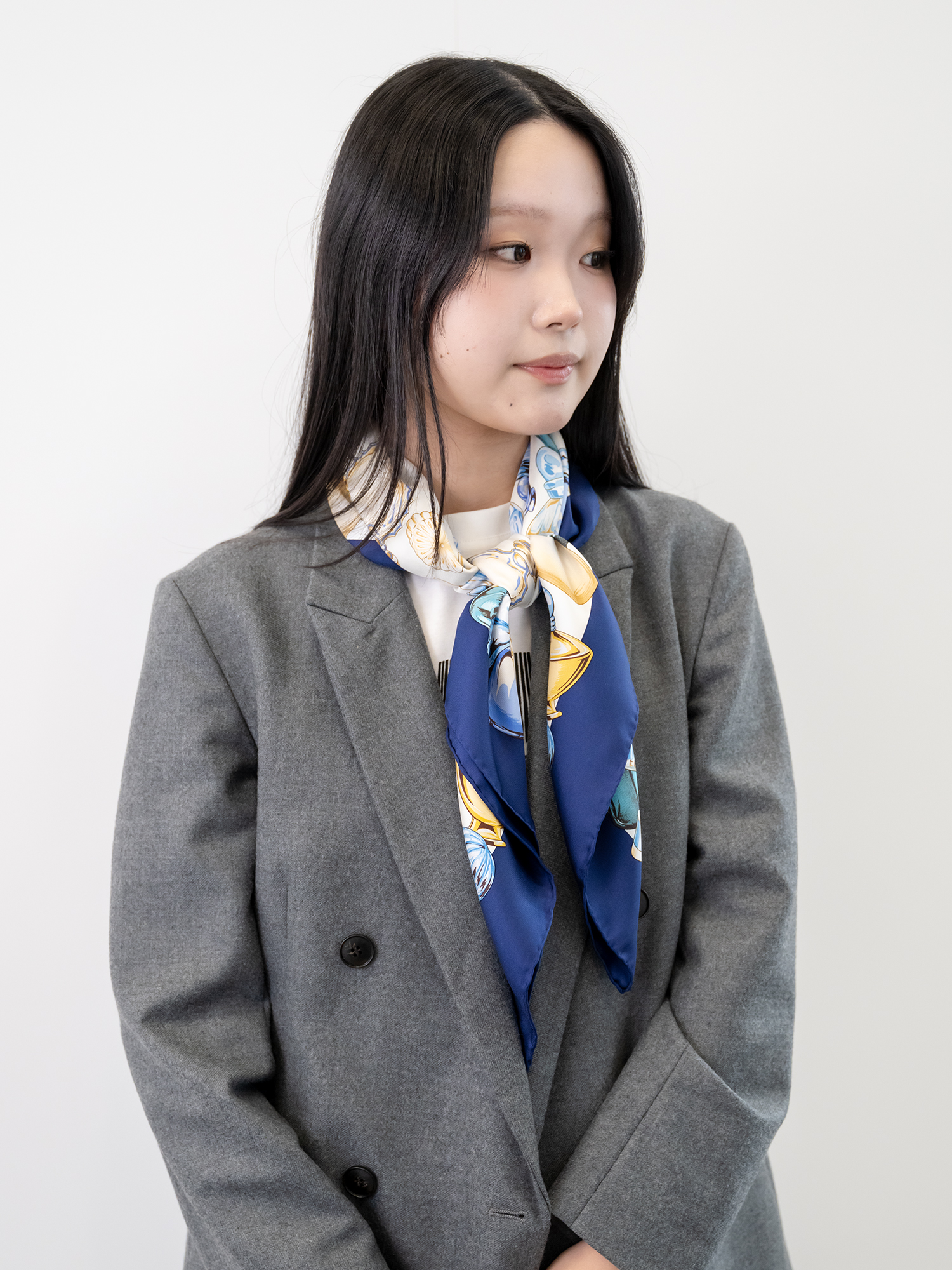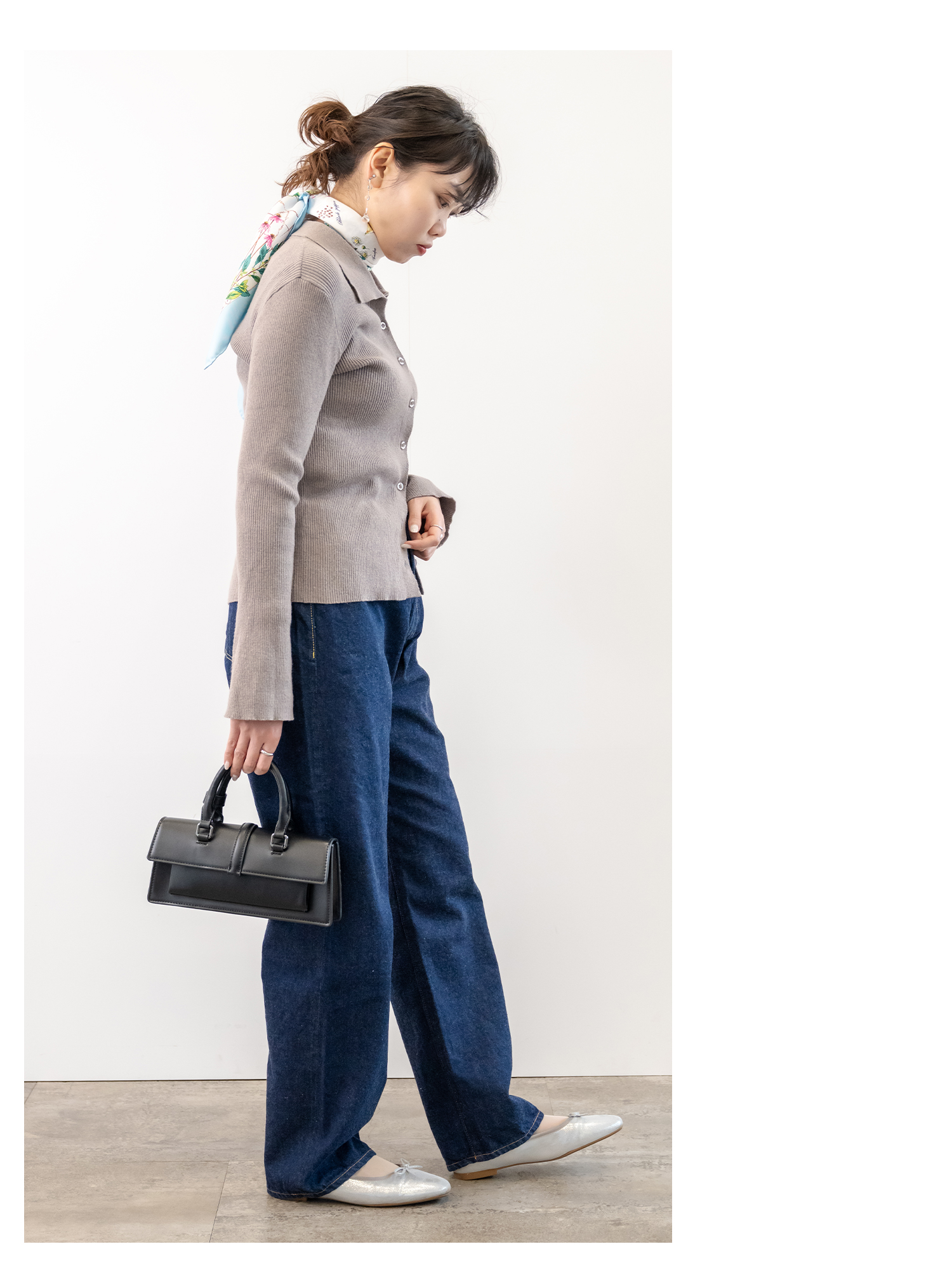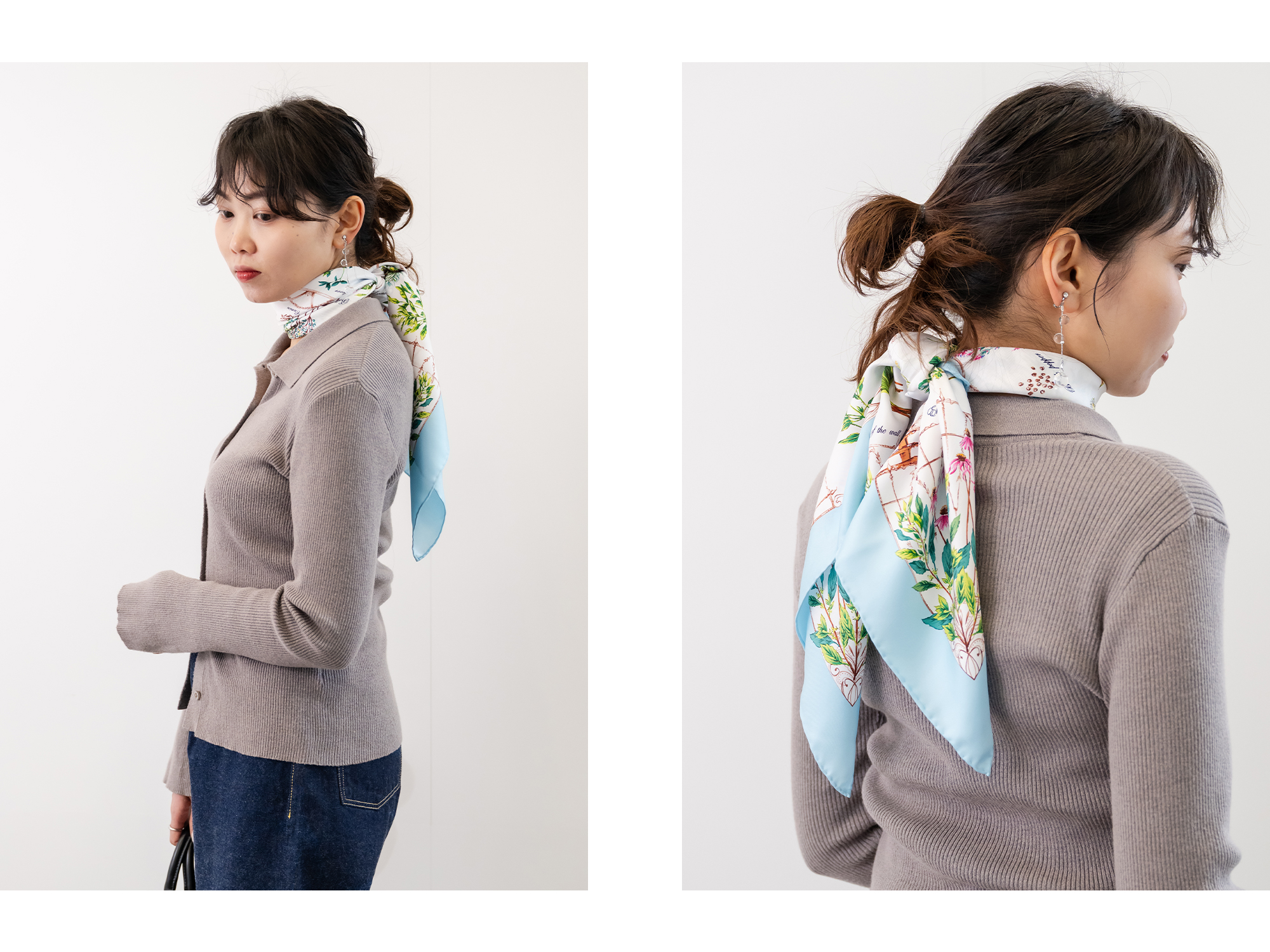 シンプルな合わせだからこそ、春色のスカーフを取り入れると一気に明るい印象になります。