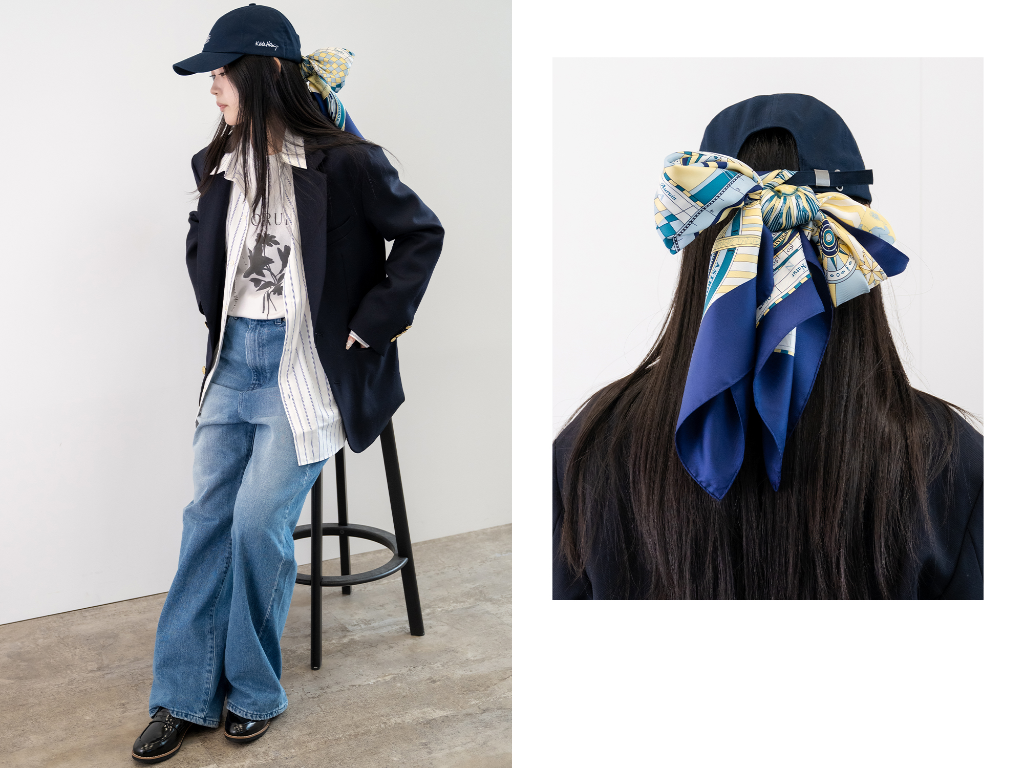 ライトブルーのデニムというカジュアルなコーデの中に、ネイビーのキレイめスカーフを取り入れると一気にオトナっぽい印象に。