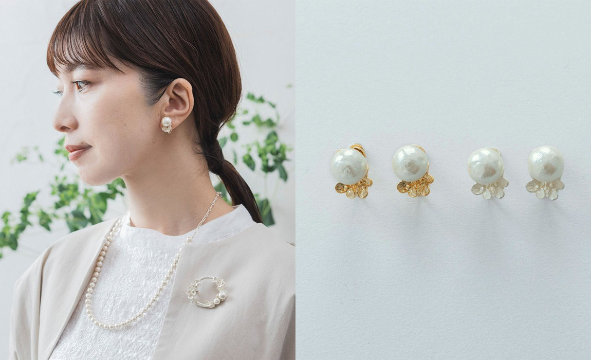 春らしいフラワーモチーフに、やわらかな光を添えるコットンパールが揺れるイヤリング。