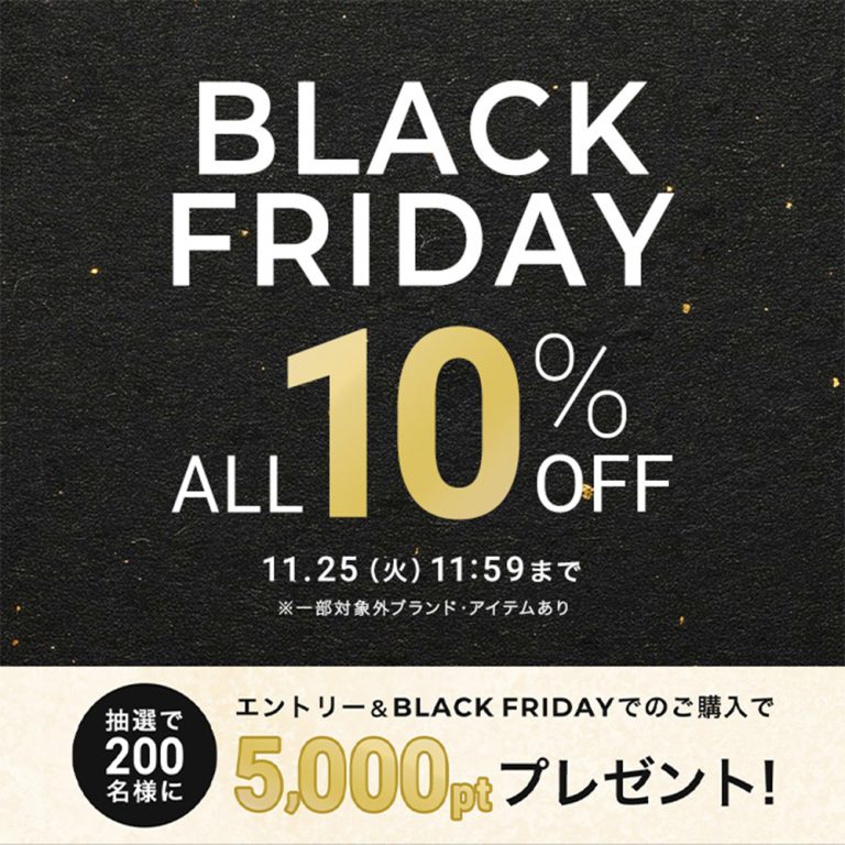 全商品がお得なBLACK FRIDAY開催中!11月21(金)正午より、新作・セールアイテム、予約商品が10%OFFになる【BLACK FRIDAY】を開催!